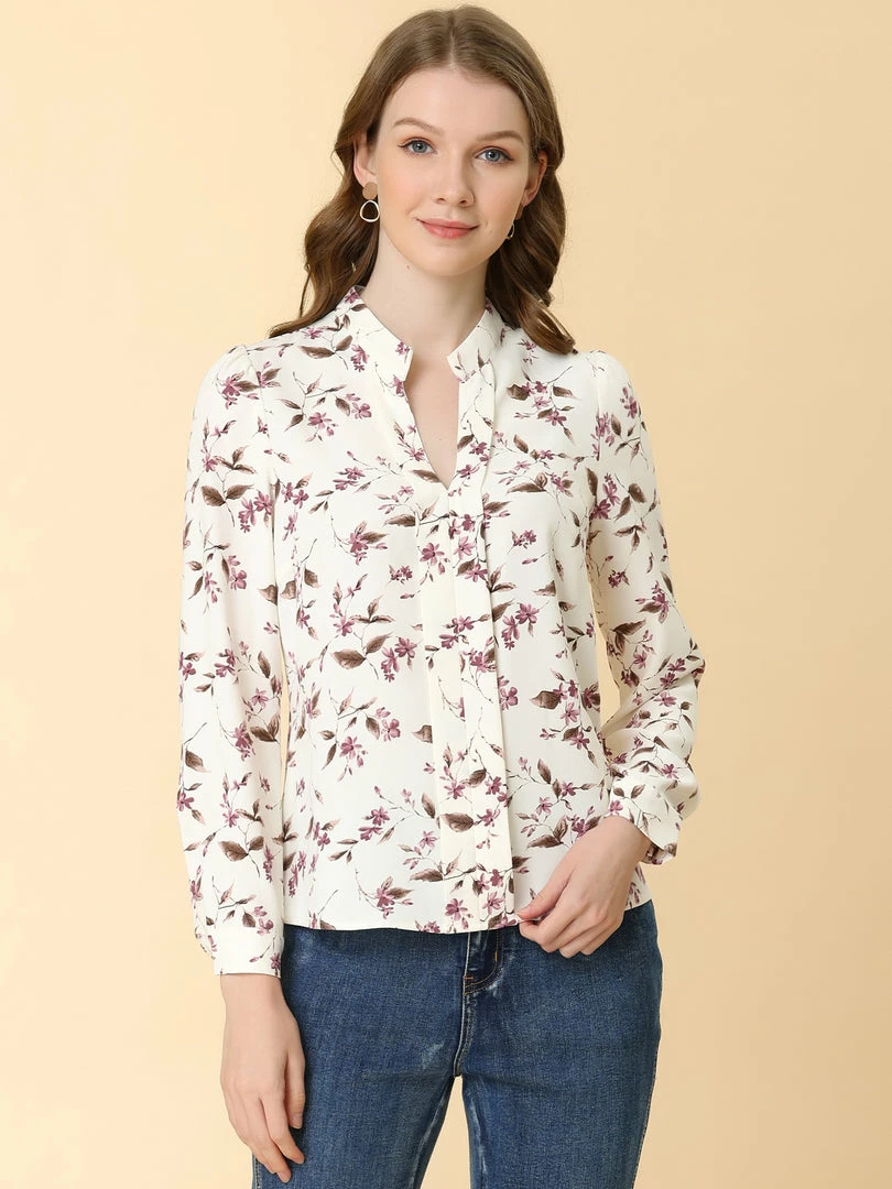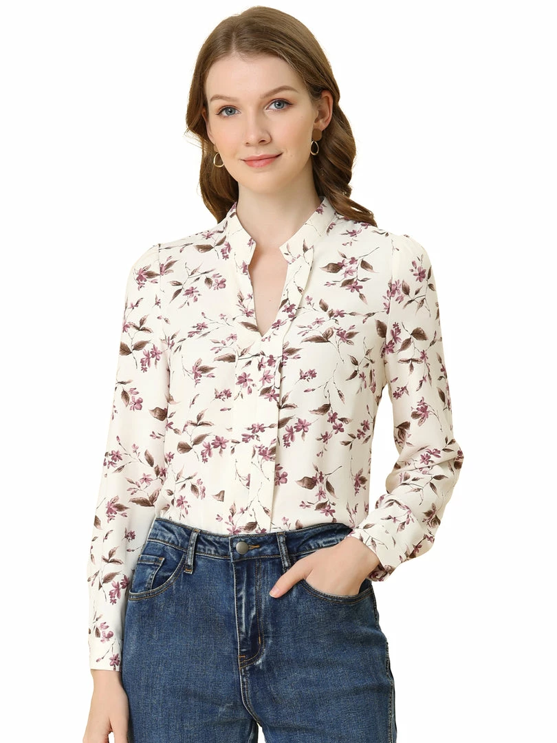 Allegra K Women’s Floral Print Notch V Neck Office Long Sleeve Blouse