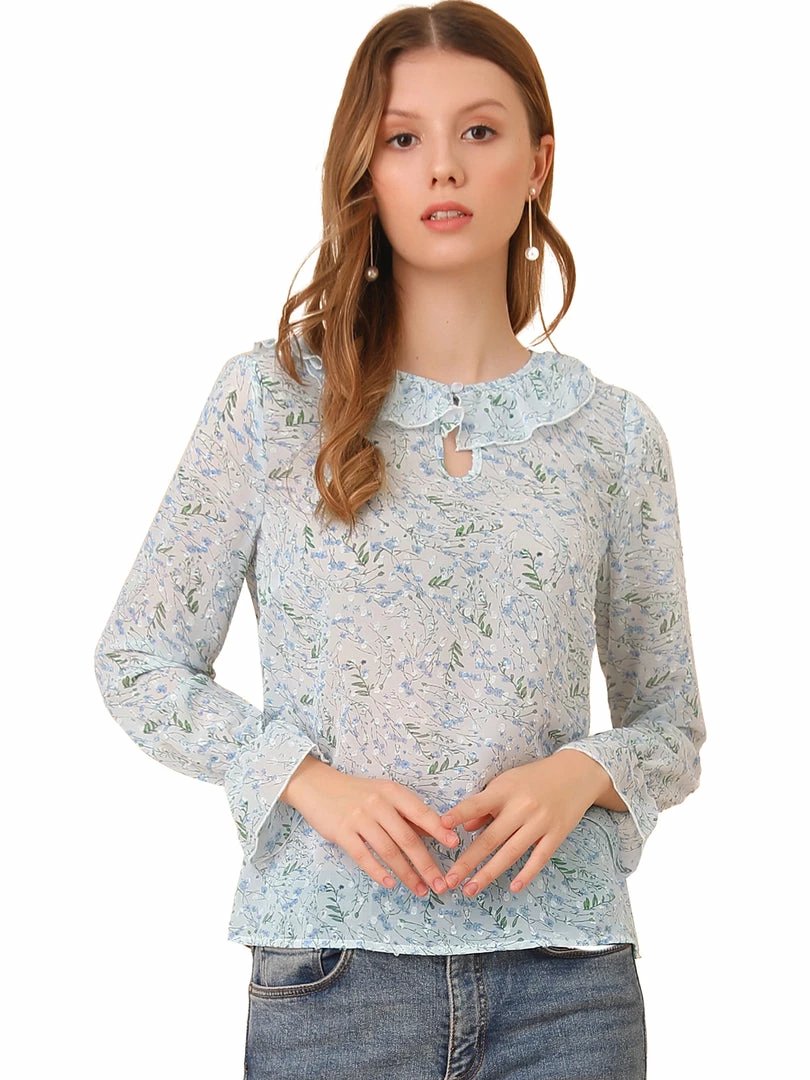 Allegra K Women’s Floral Print Ruffle Collar Keyhole Front Long Sleeve Chiffon Tops