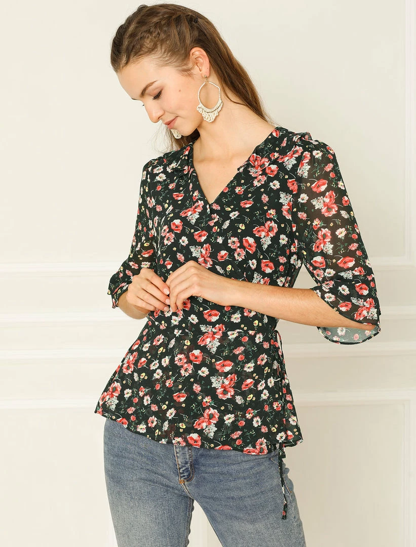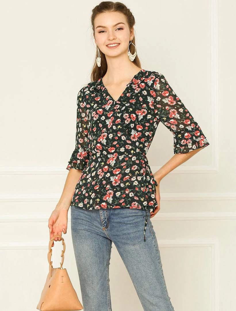 Allegra K Women’s Floral Print Ruffle Cuff Self Tie V Neck Wrap Chiffon Top Shirt