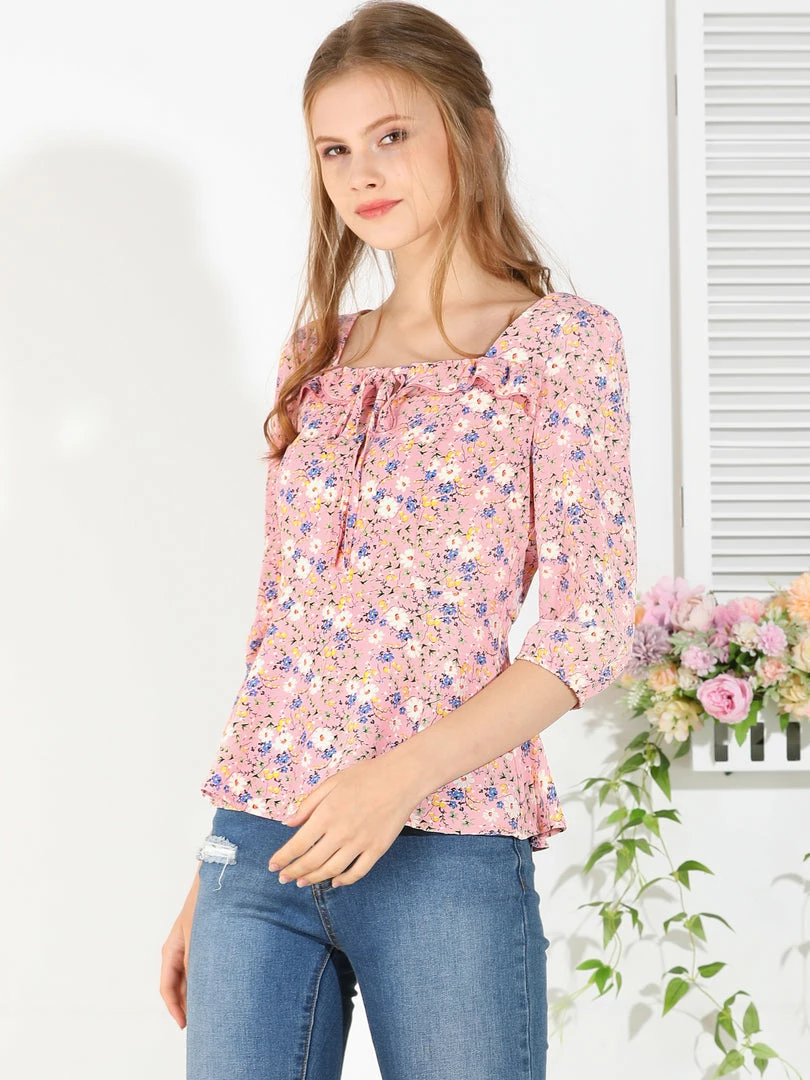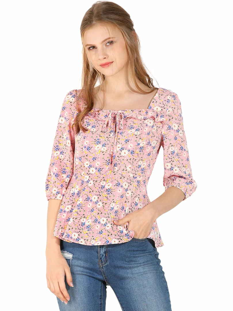 Allegra K Women’s Floral Print Ruffle Hem Tie Blouse Square Neck Vintage Top