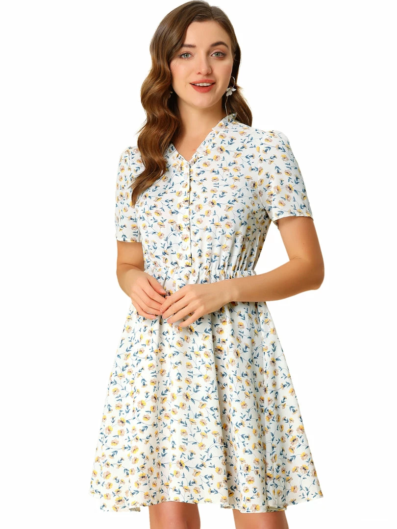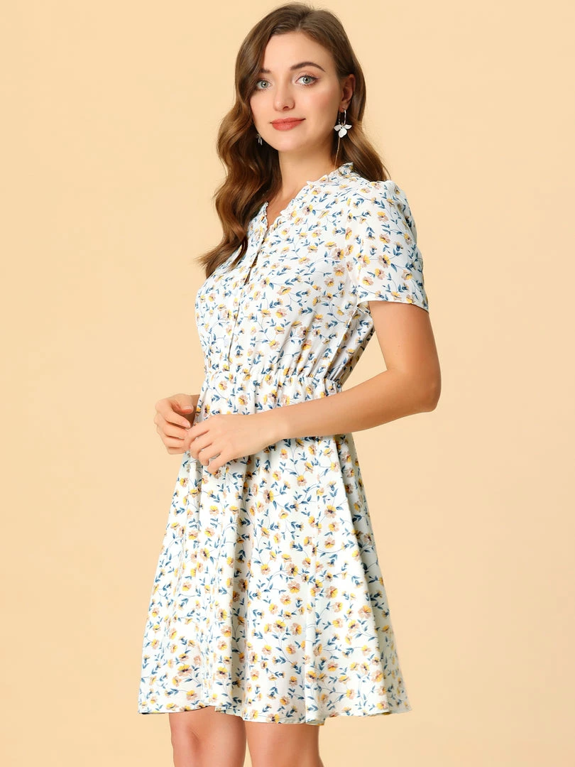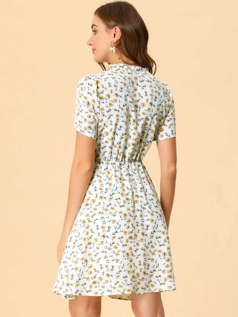 Allegra K Women’s Floral Print Ruffle V Neck Button Up Dress