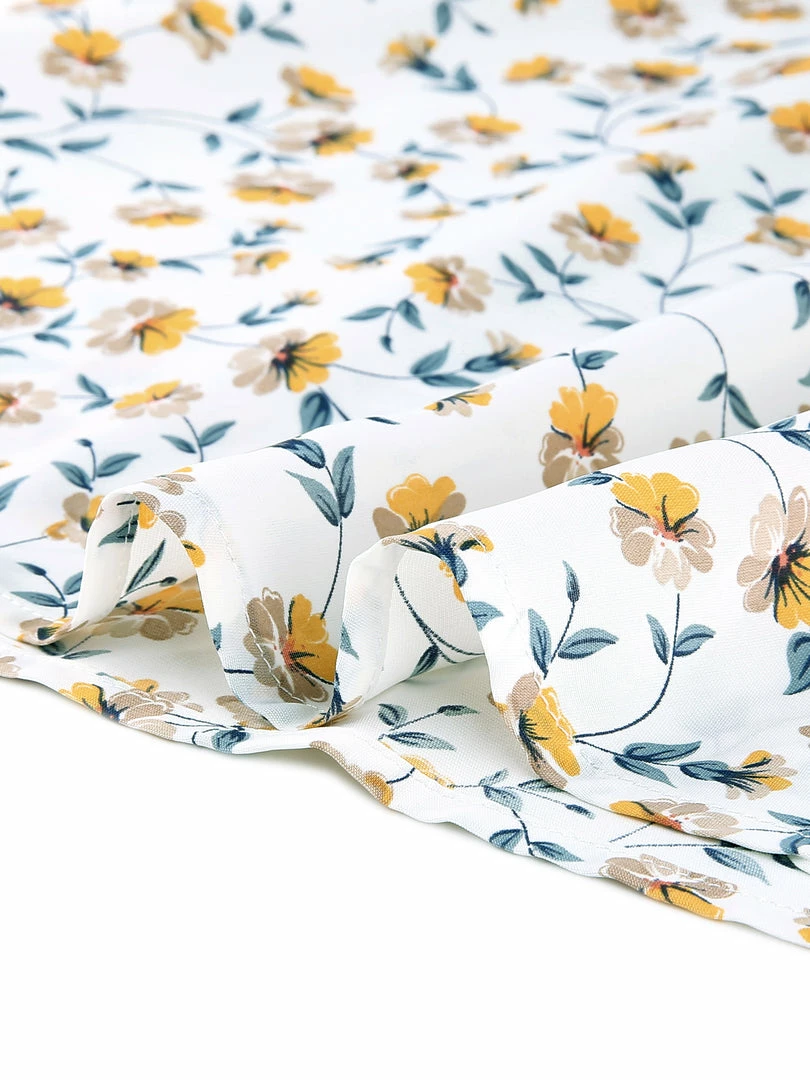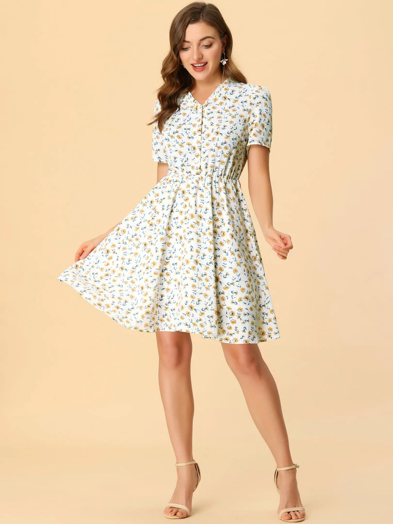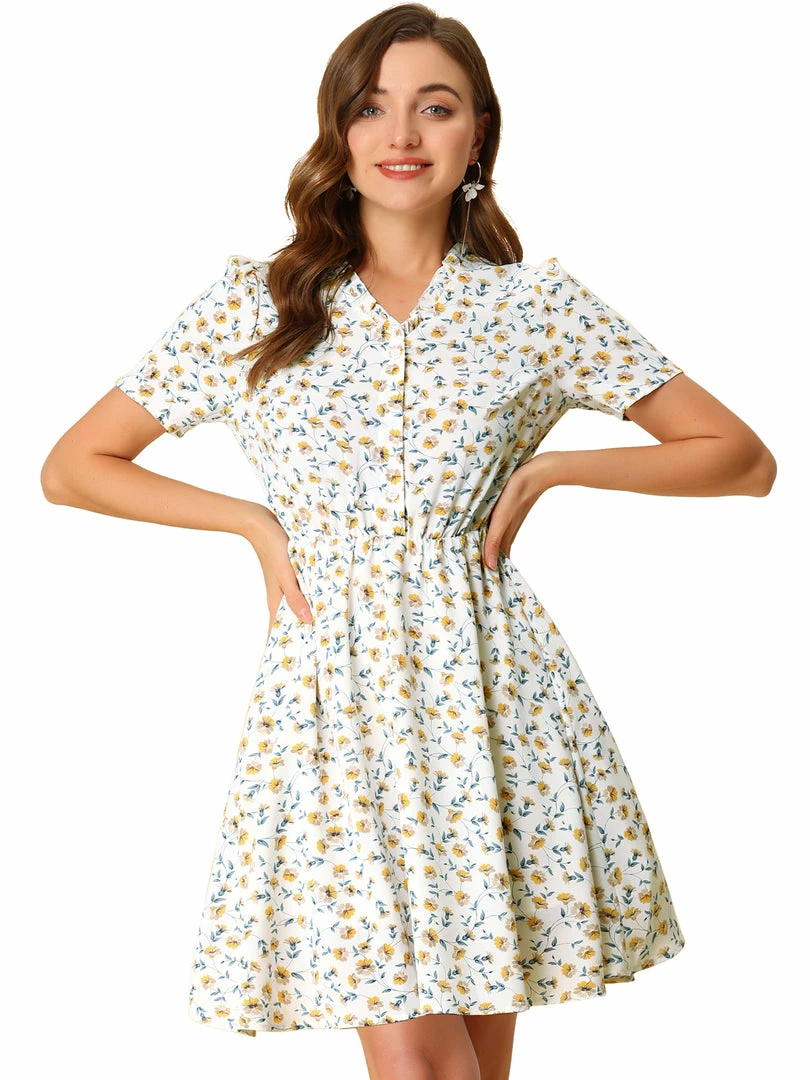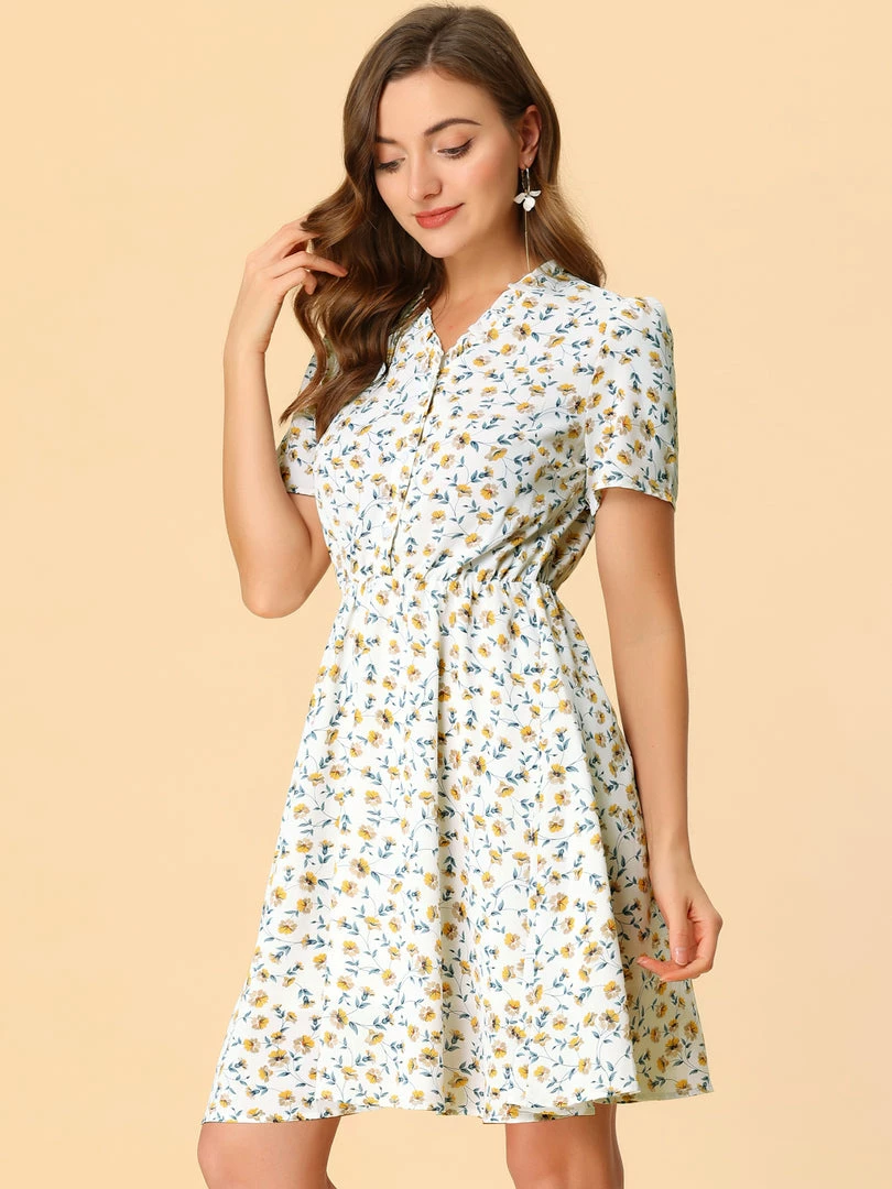 •This dress features yellow floral printed, v neckline, short sleeves, elasticed waist.