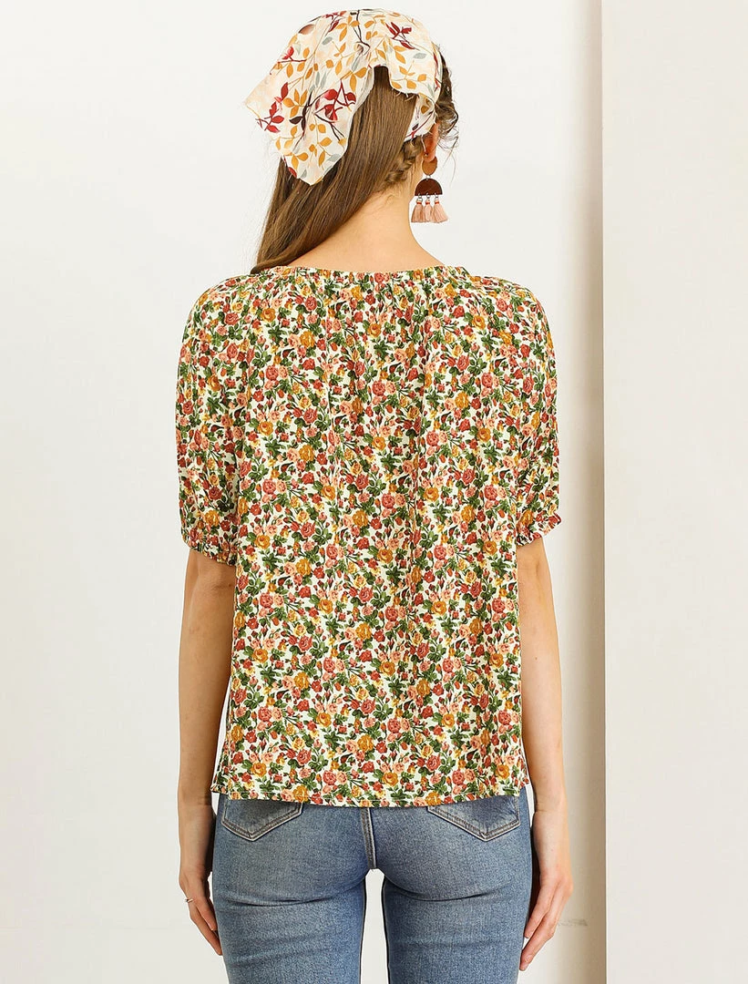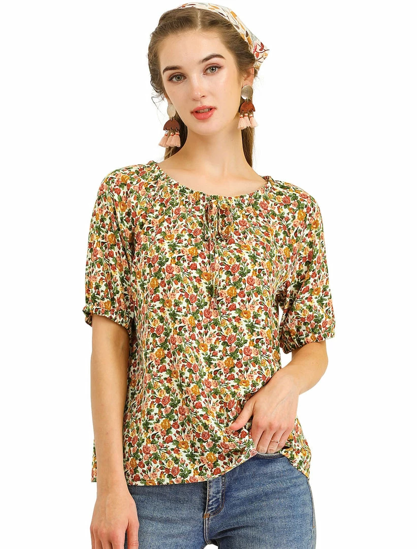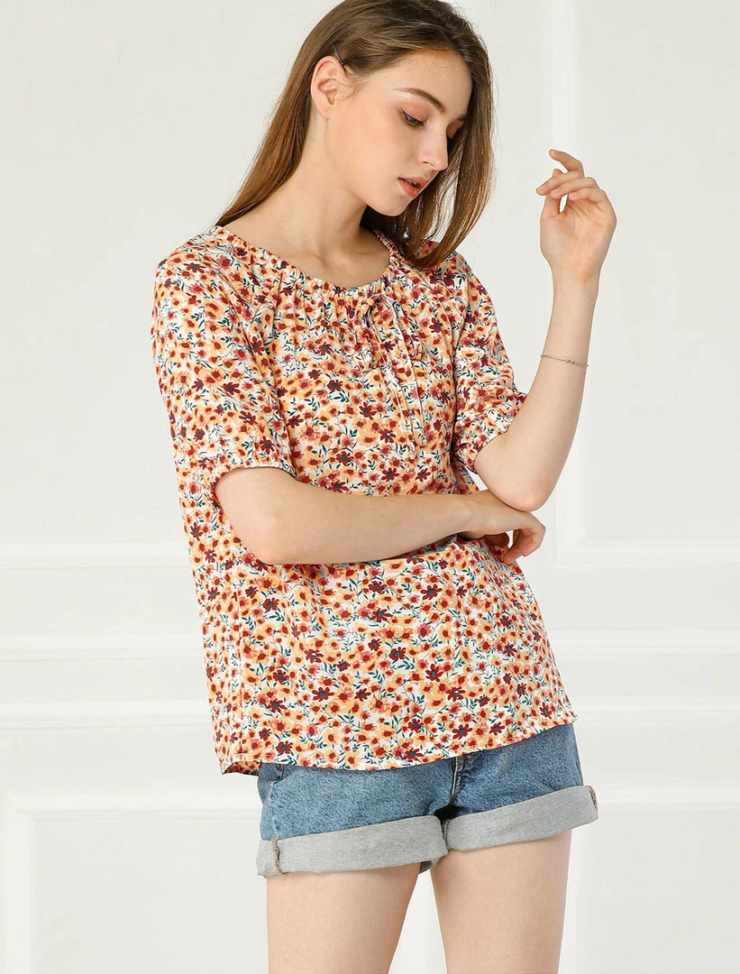 Allegra K Women’s Floral Print Tie Neck Blouse Casual Puff Short Sleeve Tops