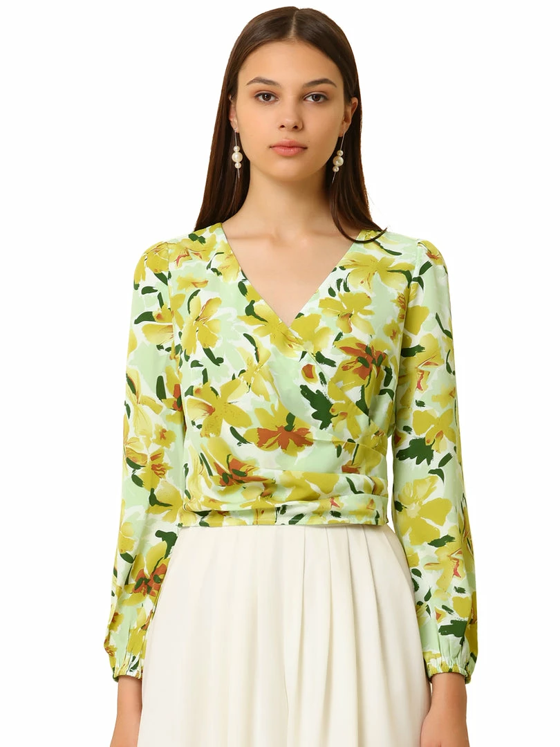 Allegra K Women’s Floral Print V Neck Pleated Waist Lantern Long Sleeve Crop Top