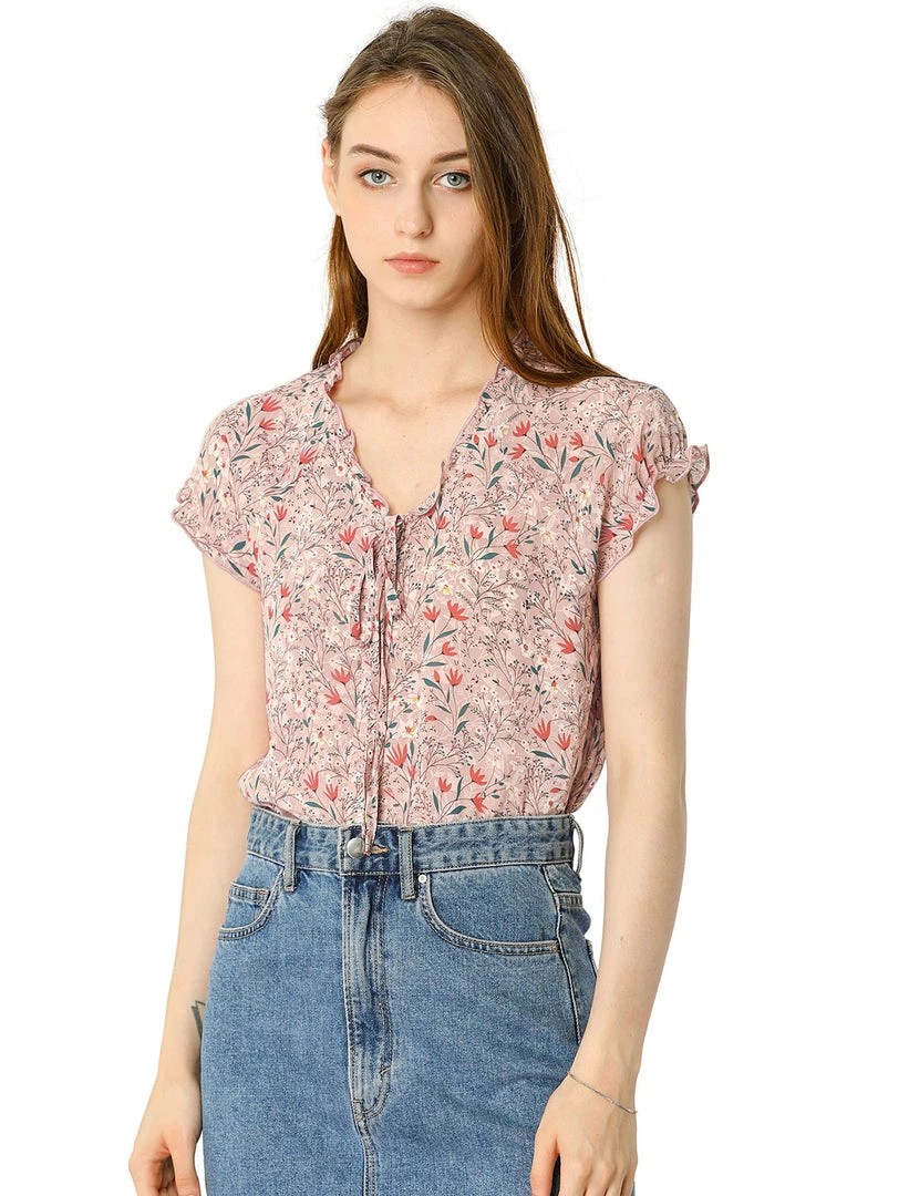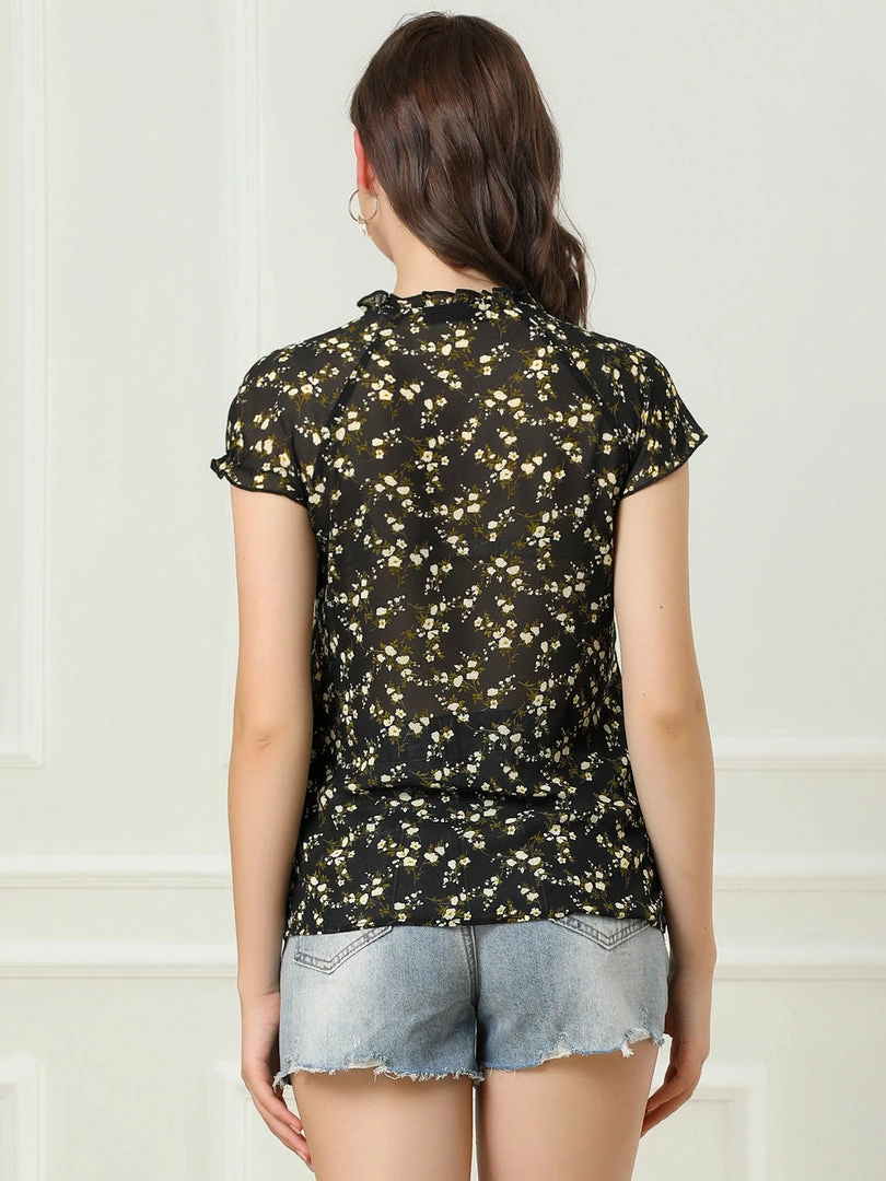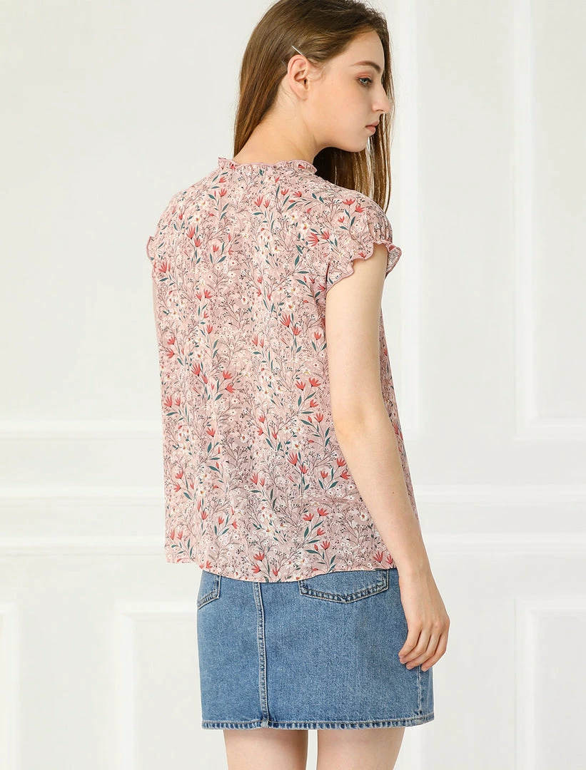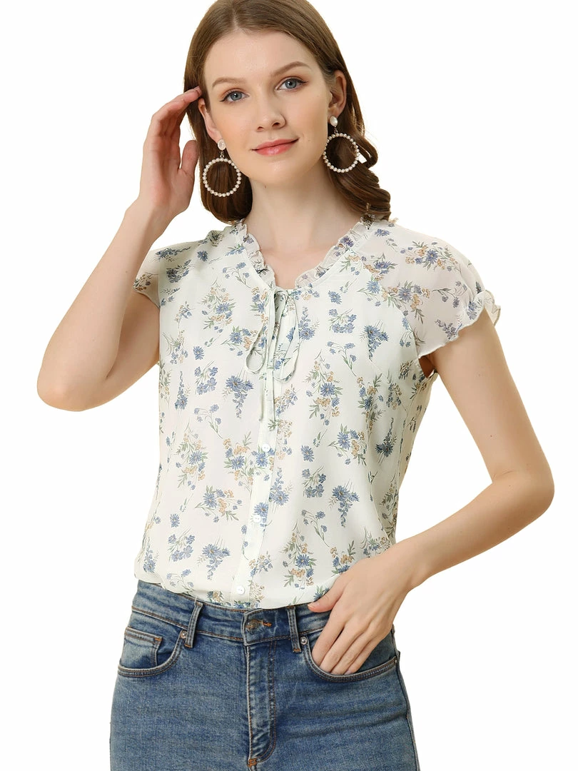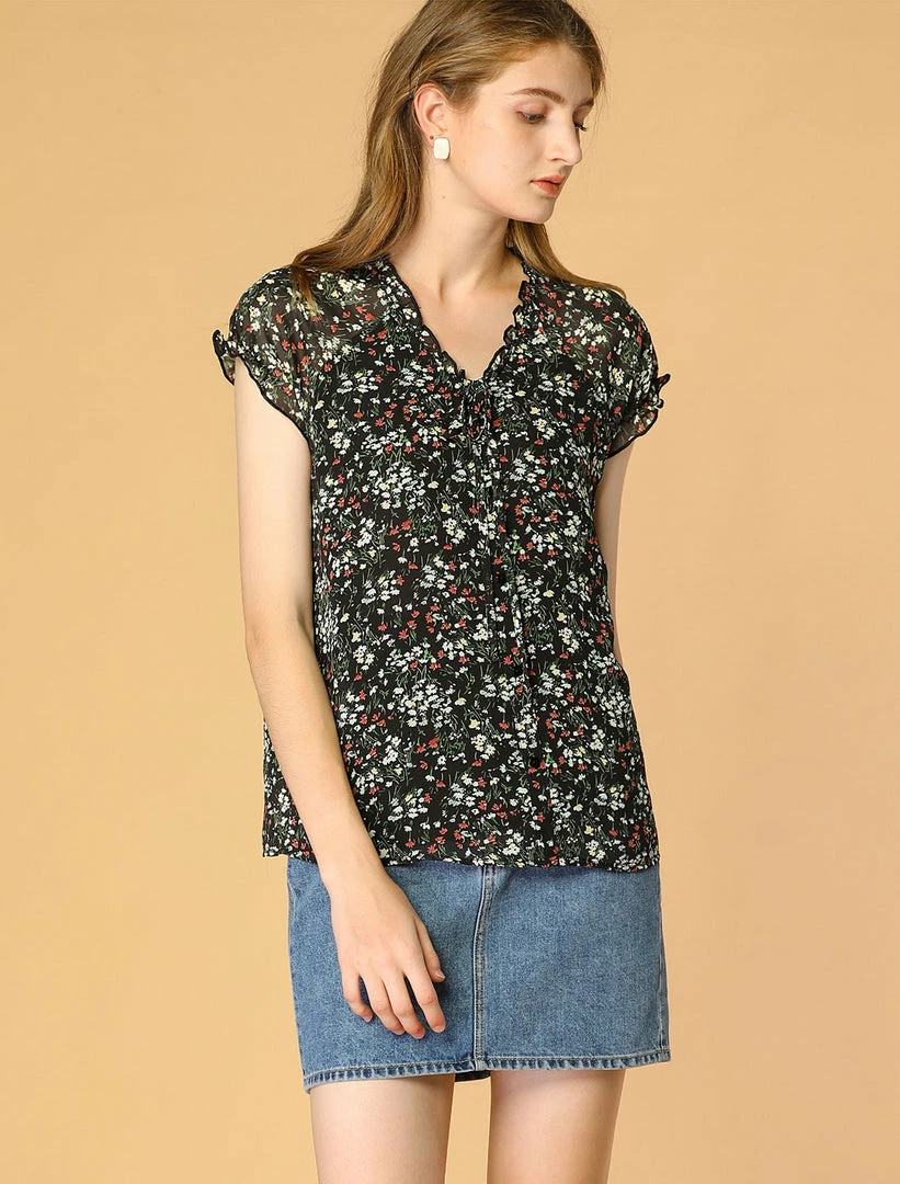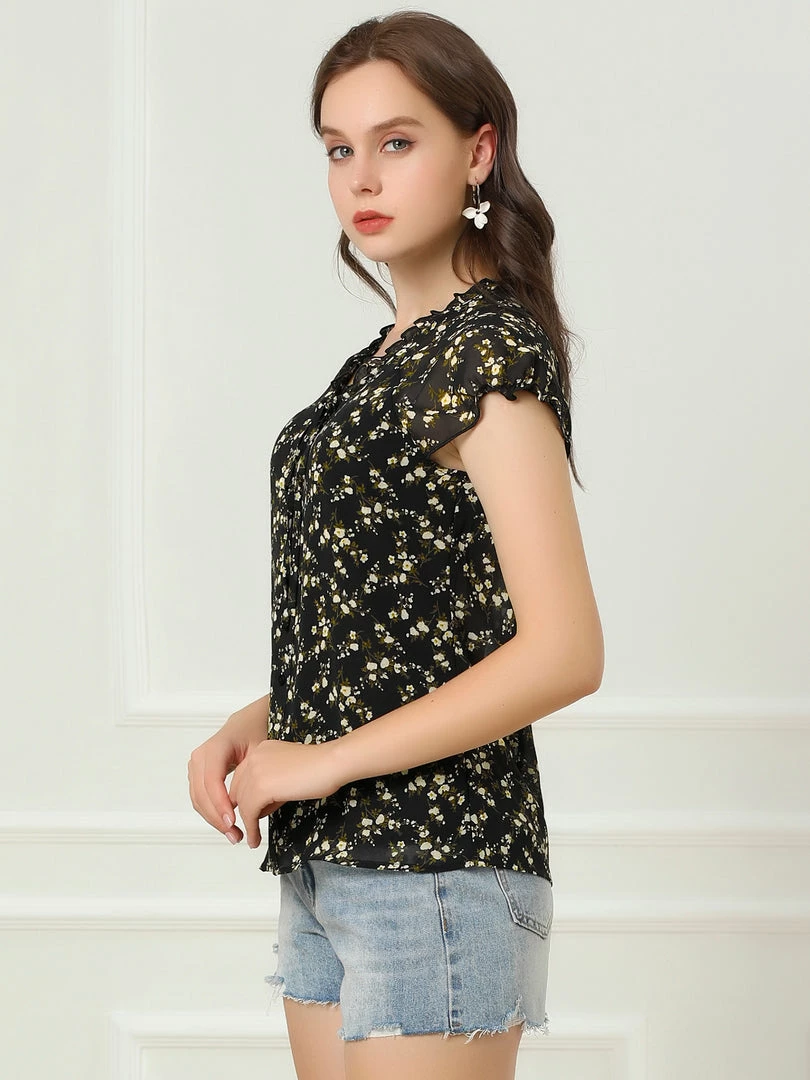 Allegra K Women’s Floral Printed Ruffles Cap Sleeve Chiffon Blouse Top