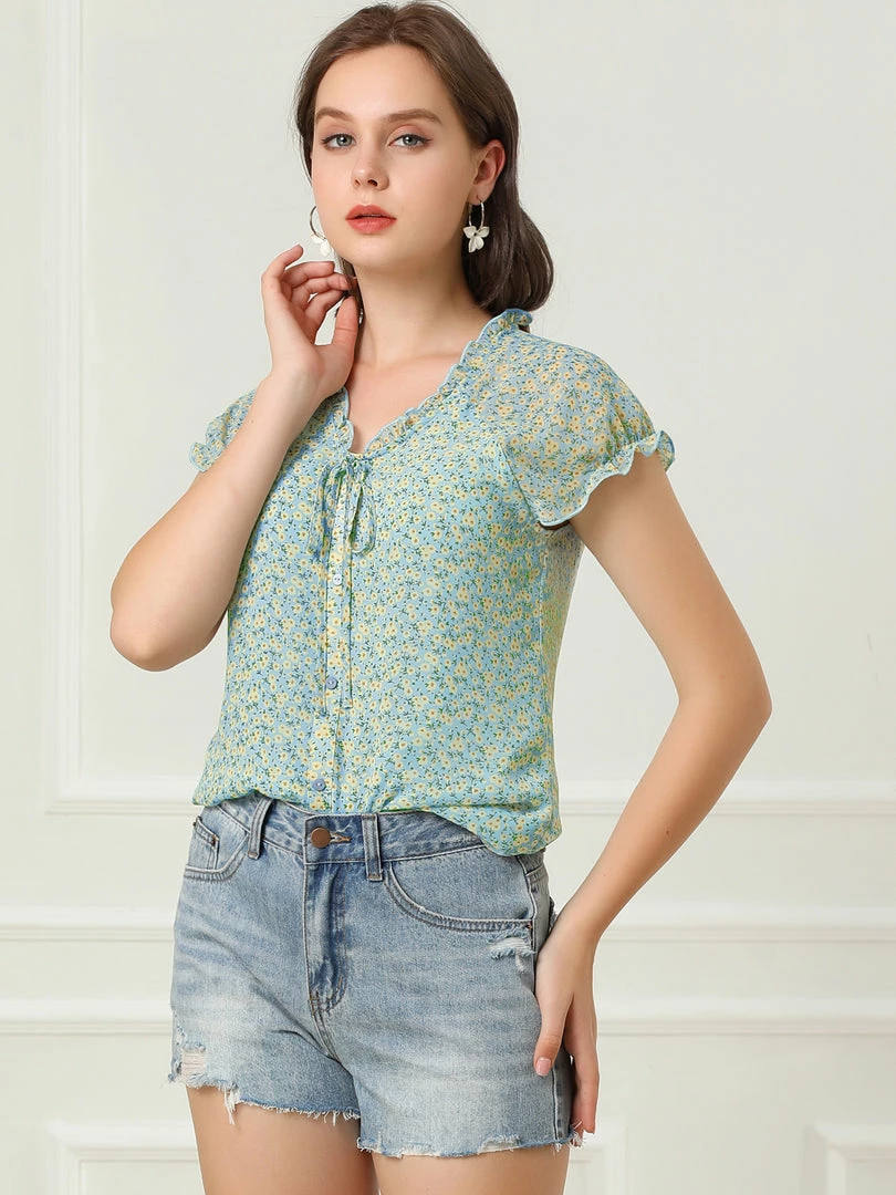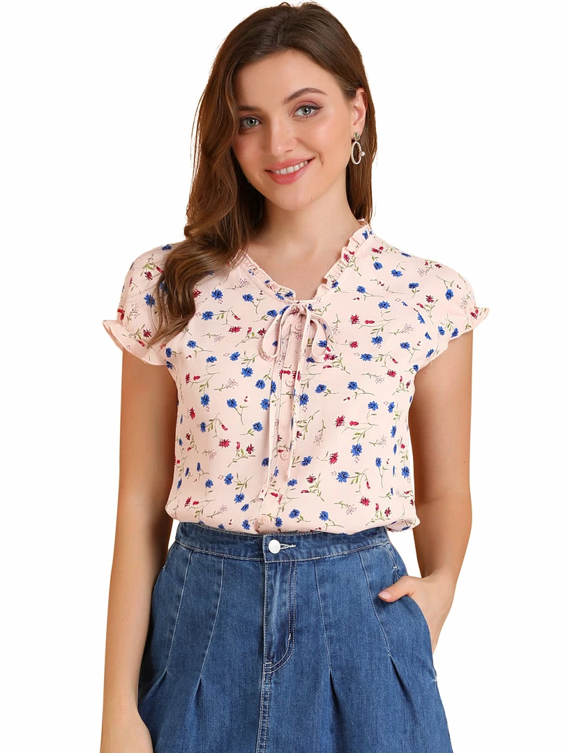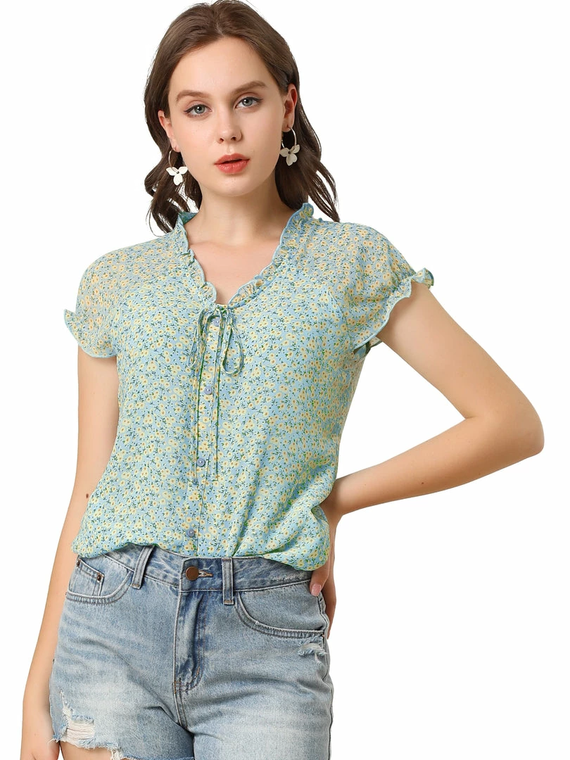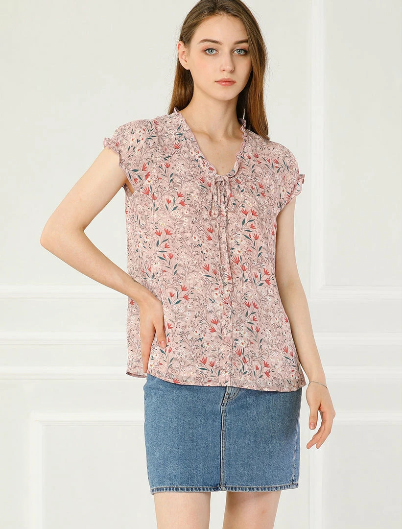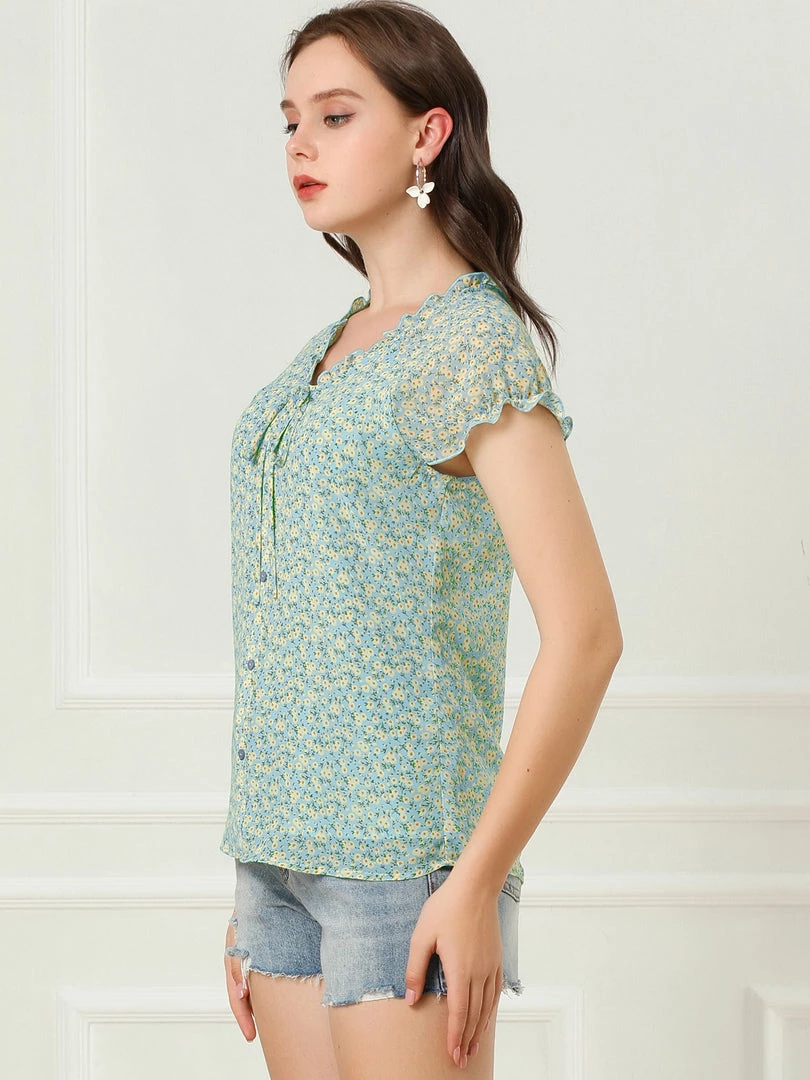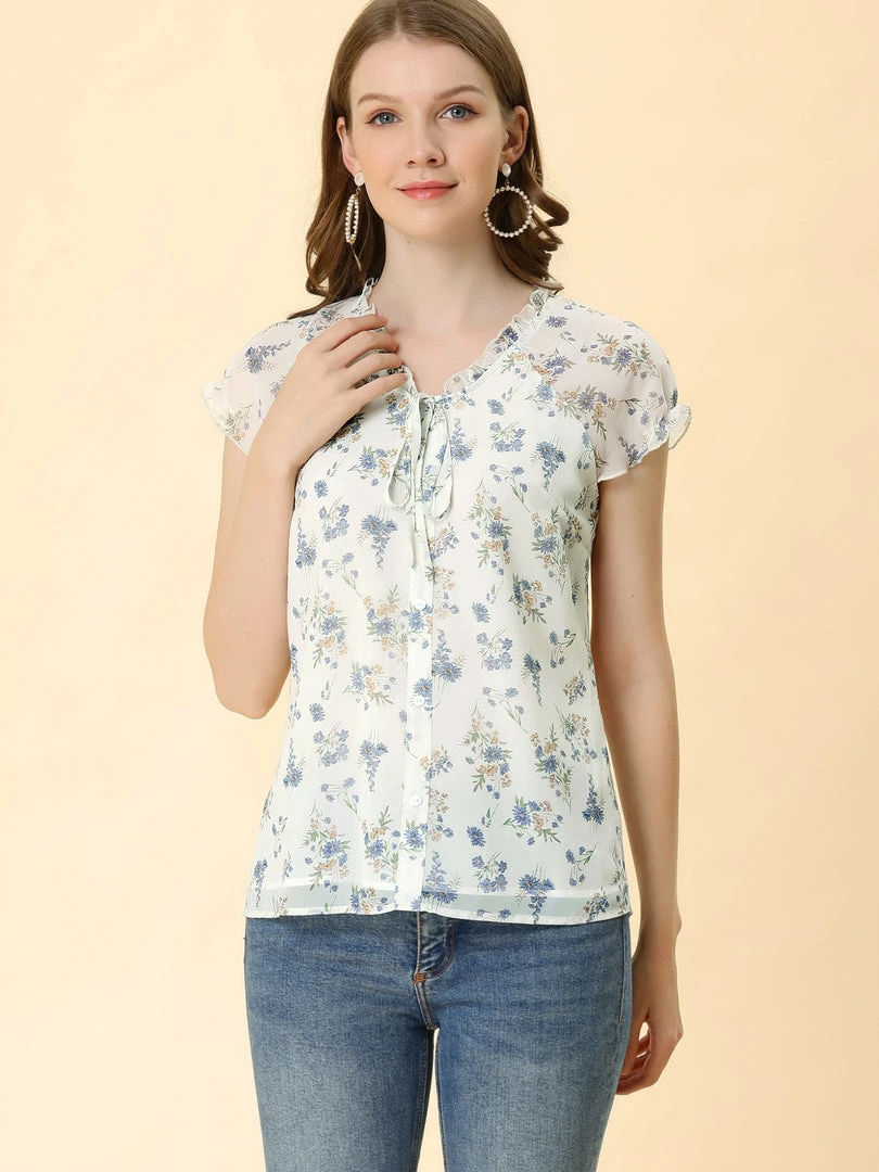 Allegra K Women’s Floral Printed Ruffles Cap Sleeve Chiffon Blouse Top