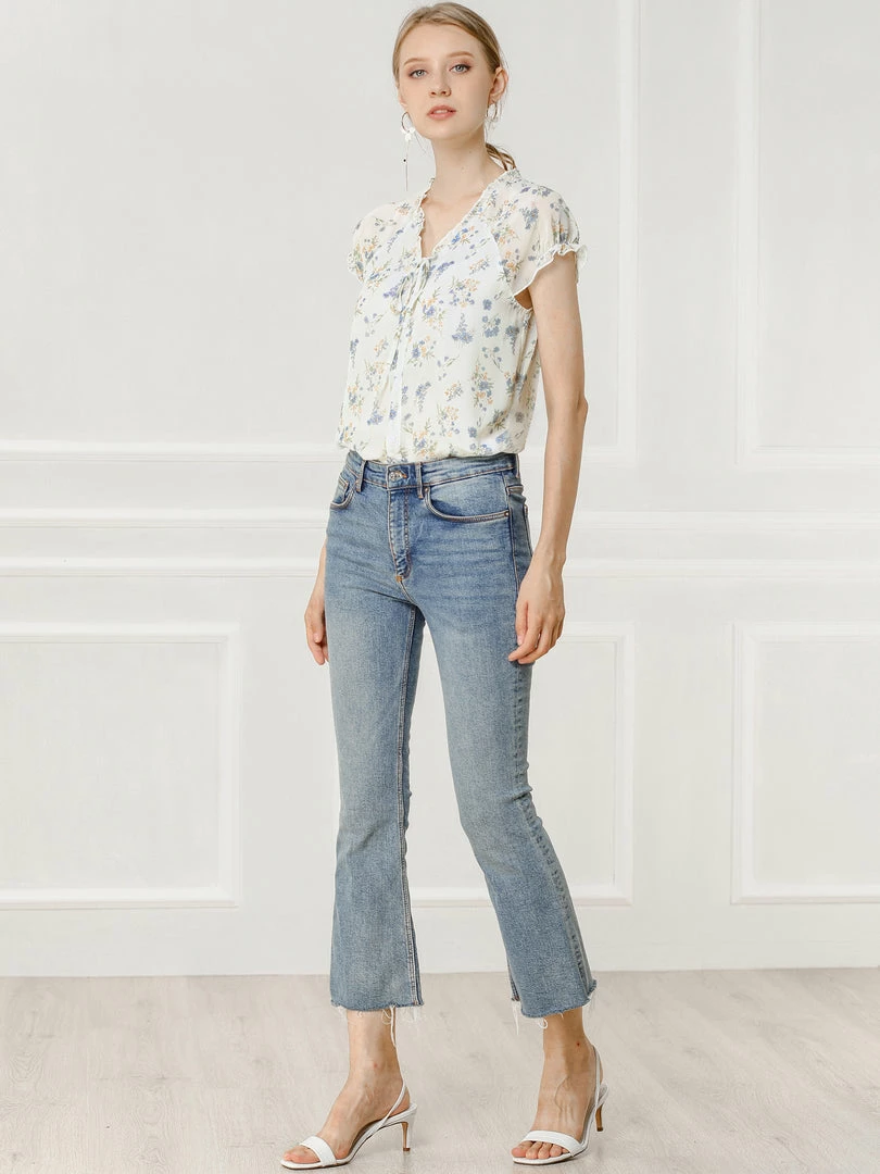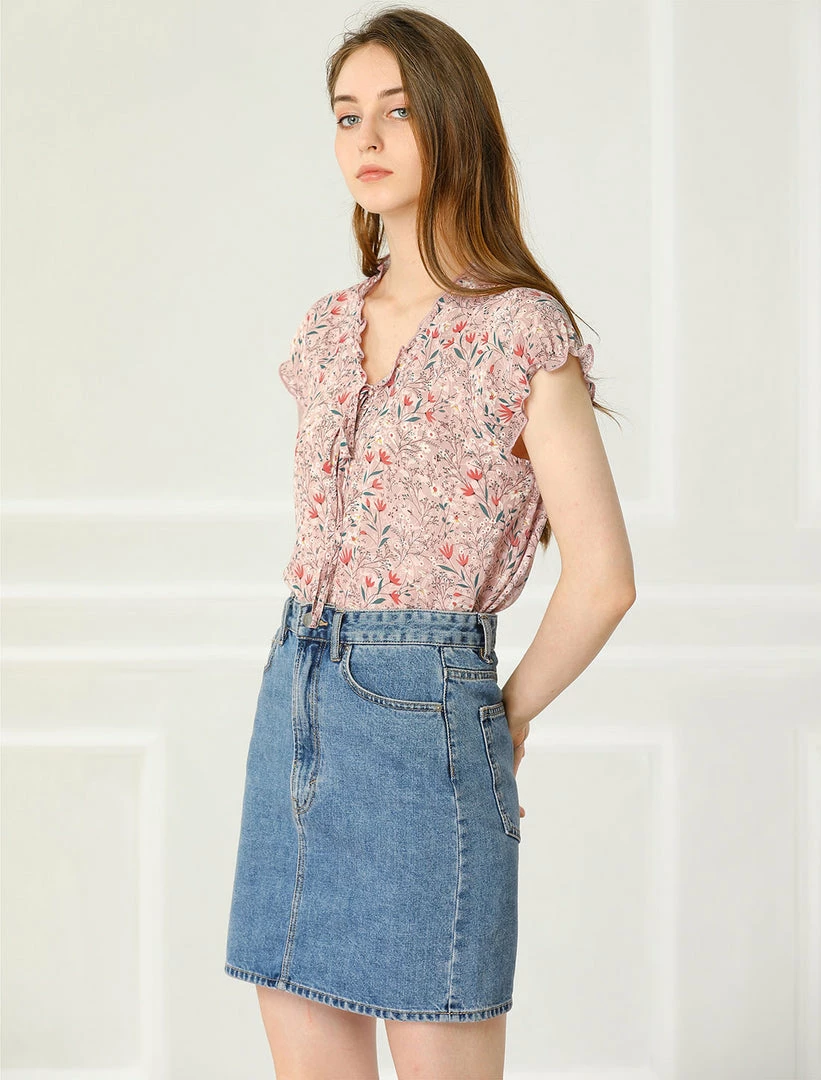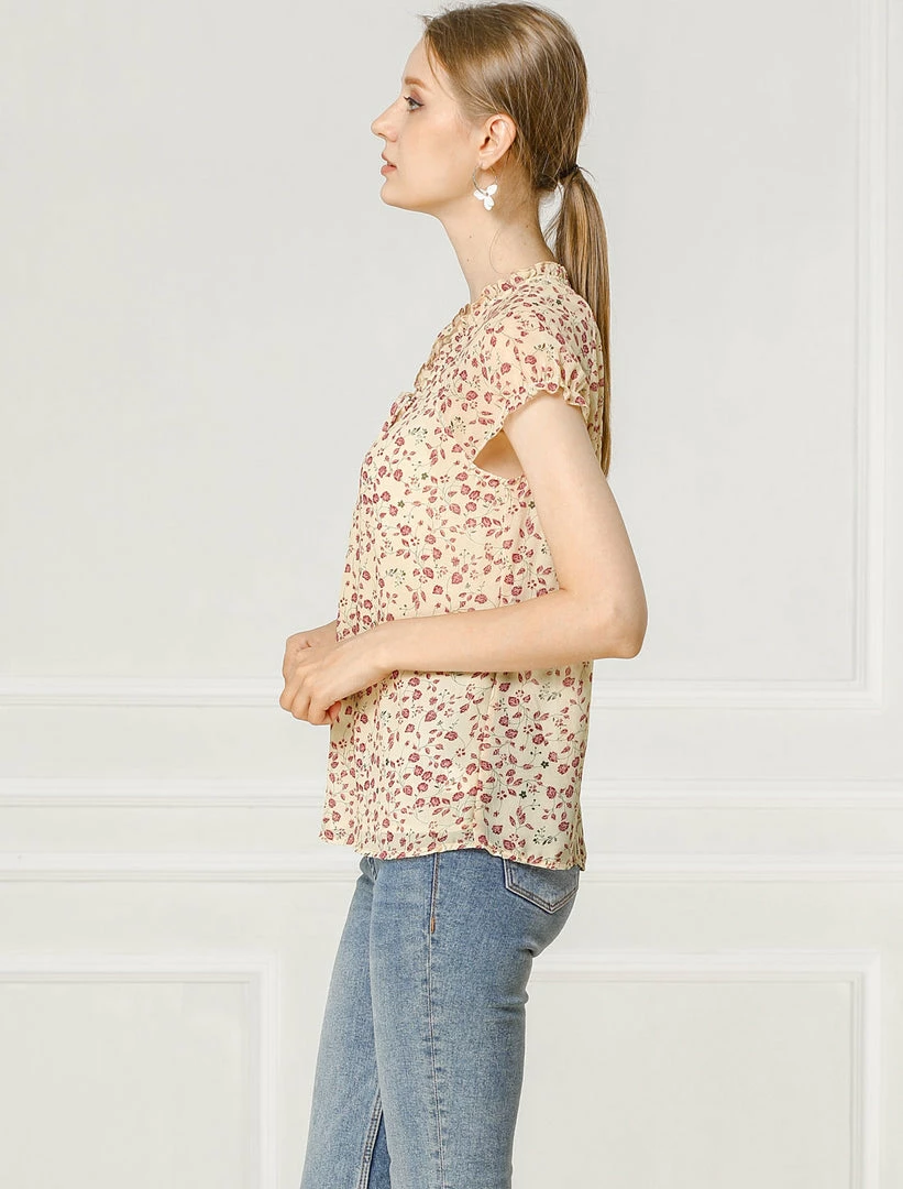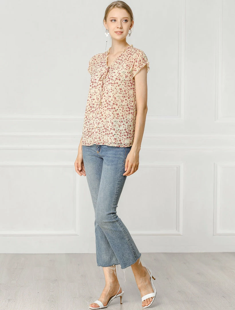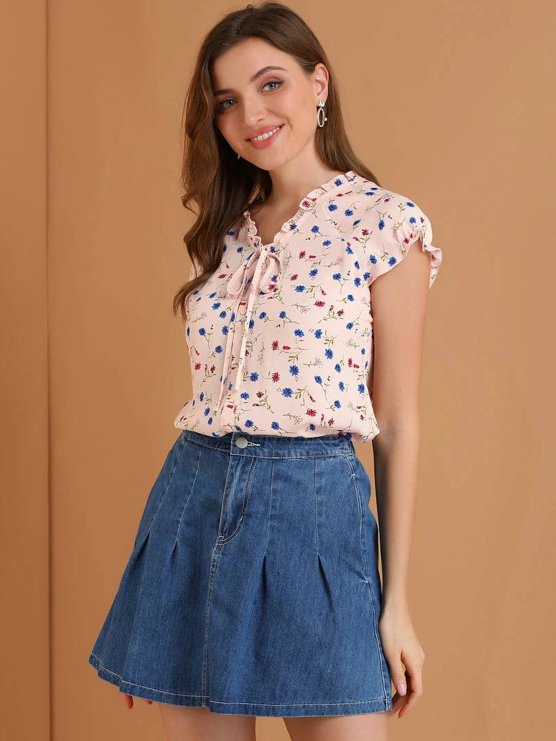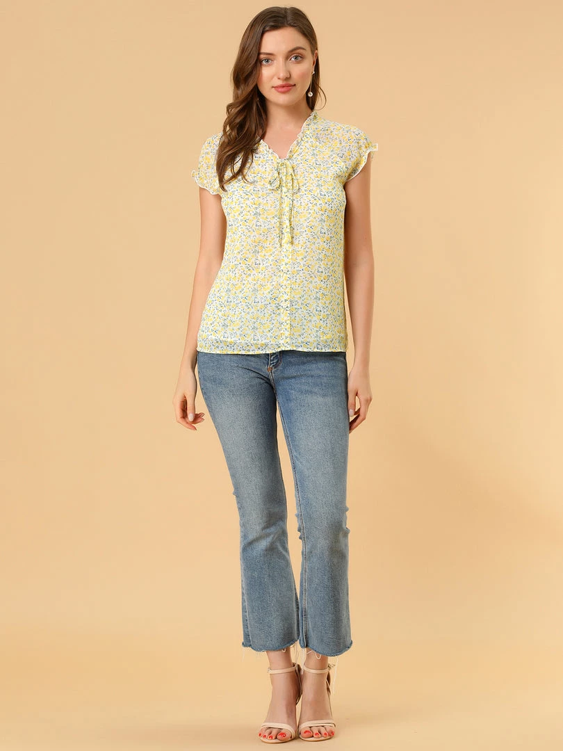 Allegra K Women’s Floral Printed Ruffles Cap Sleeve Chiffon Blouse Top