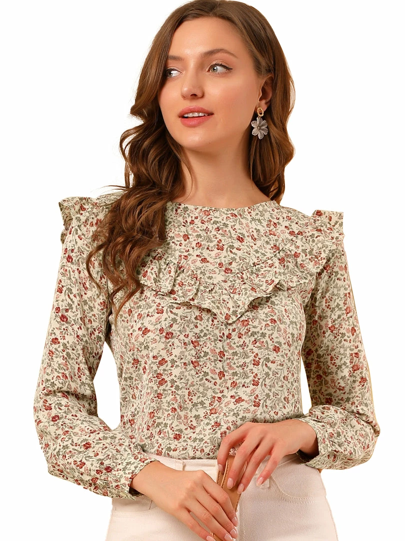 Allegra K Women’s Floral Printed Top Long Sleeve Round Neck Ruffle Collar Blouse