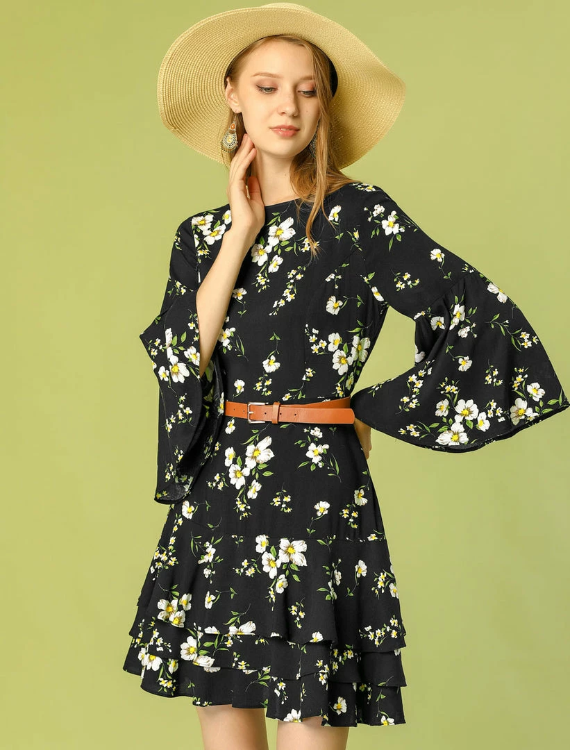 Allegra K Women’s Floral Prints Bell Sleeve Ruffle Hem Fit And Flare Dress