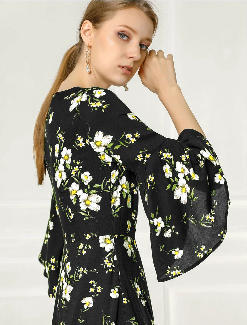 - The dark floral pattern and trumpet sleeves create both a girly and elegant aura, suitable for occasions from workplace to wedding.