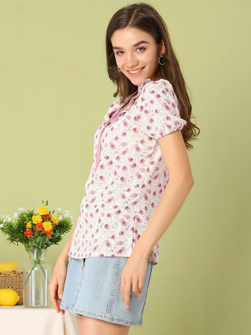 Allegra K Women’s Floral Ruffle Tie Neck Elastic Cuff Casual Blouse Top