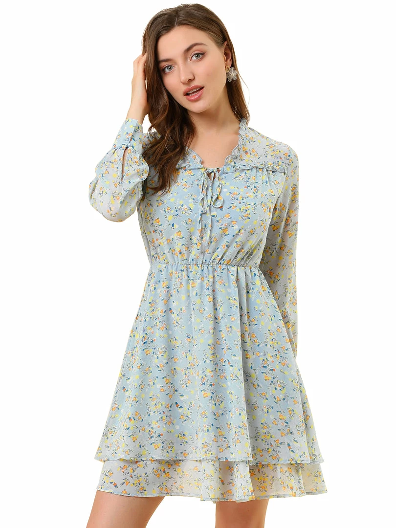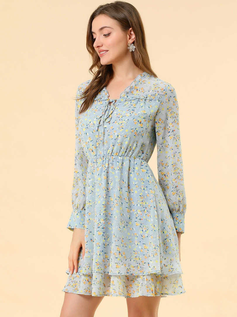 Allegra K Women’s Floral Ruffled Tie V Neck Layered Vintage Chiffon Mini Dress