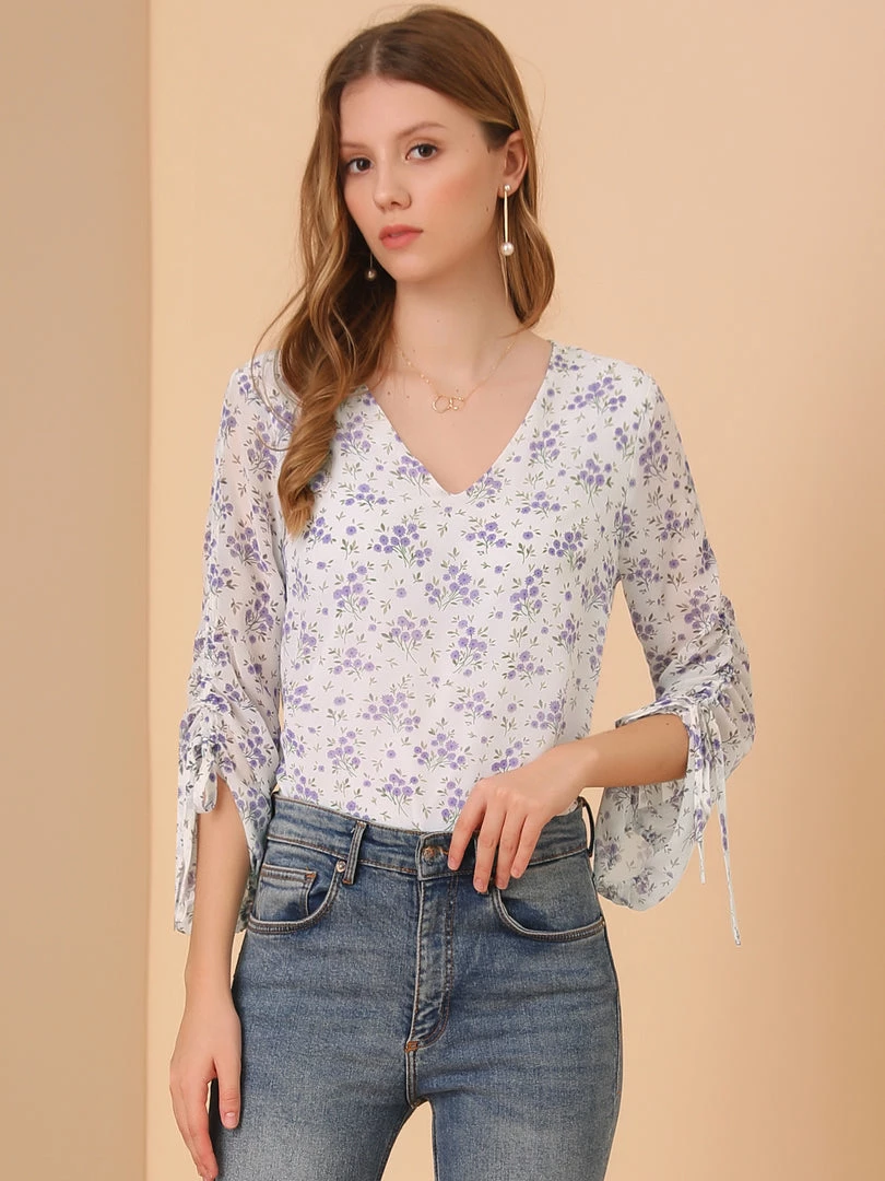 Allegra K Women’s Floral Semi-Sheer V Neck Tie Cuff Tops Elegant Chiffon Blouse