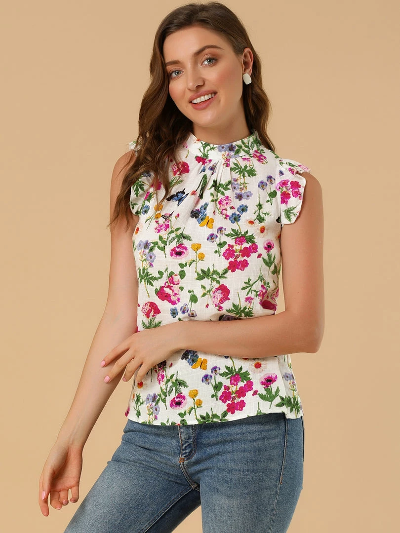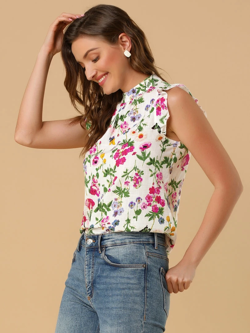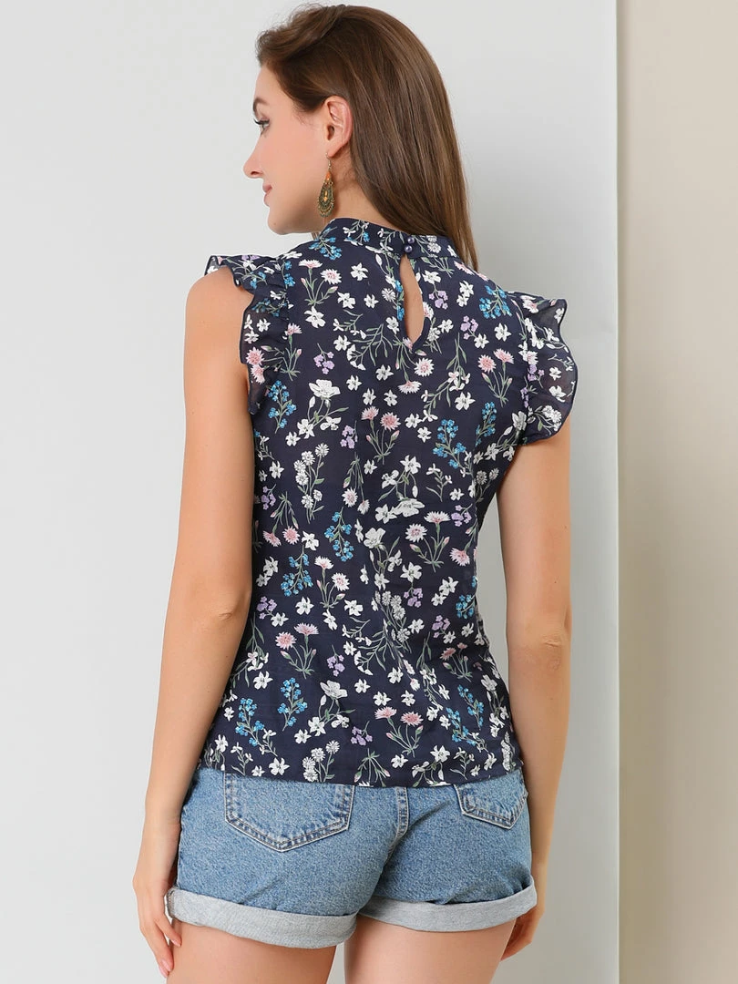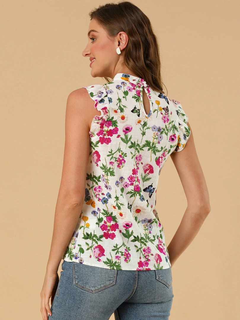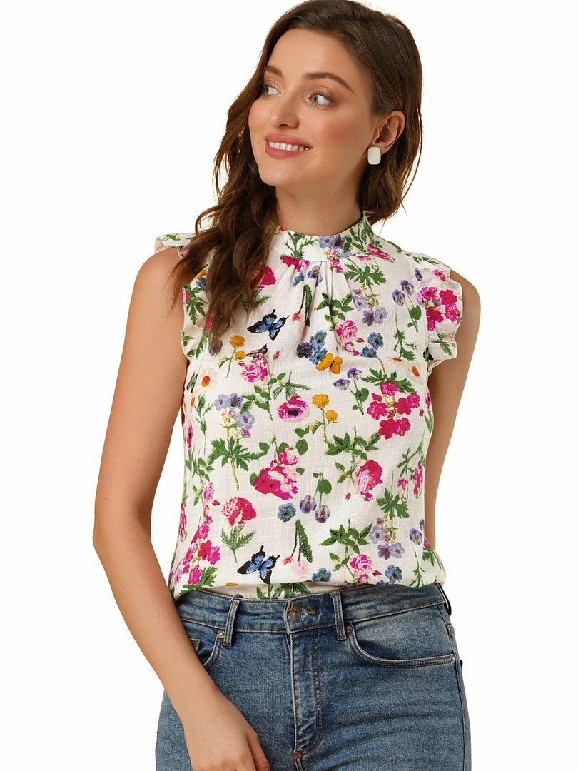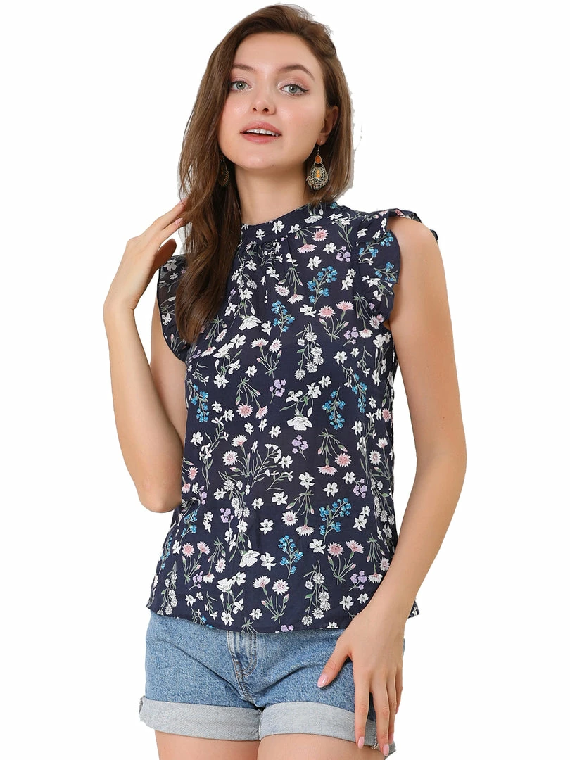 Allegra K Women’s Floral Sleeveless Blouses Stand Collar Summer Ruffle Tops