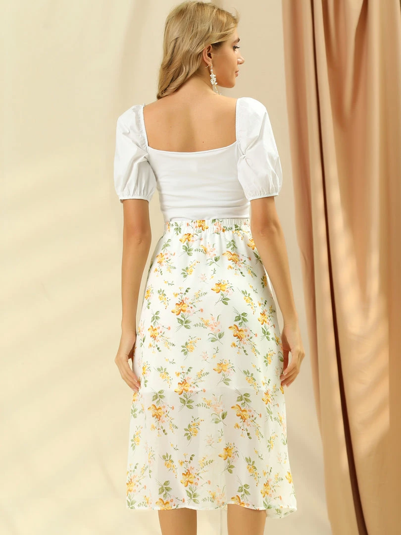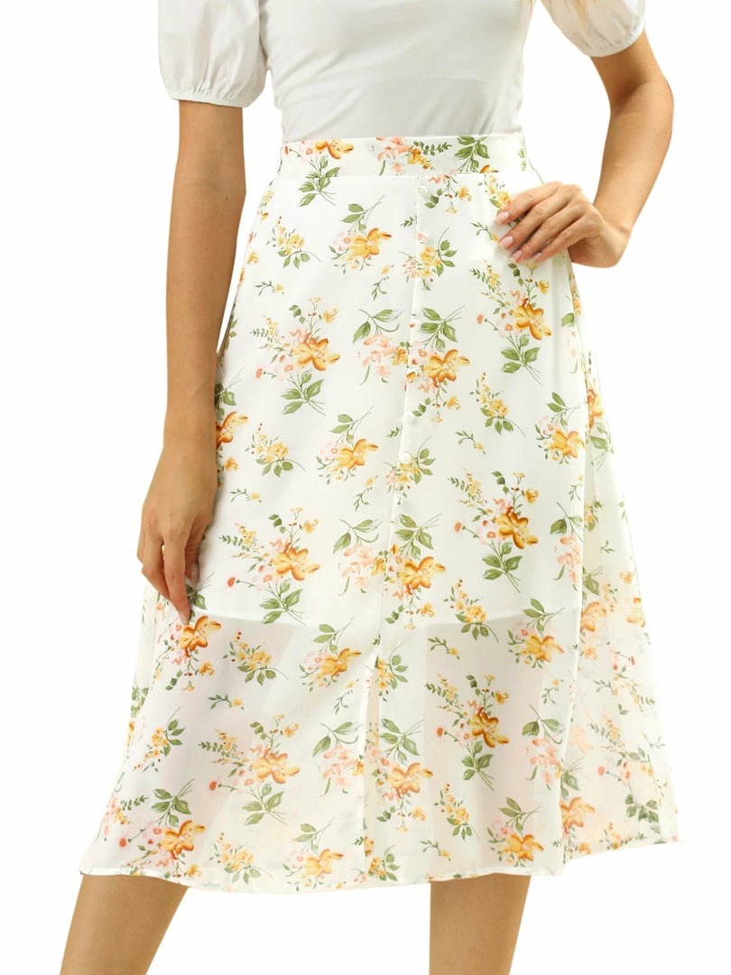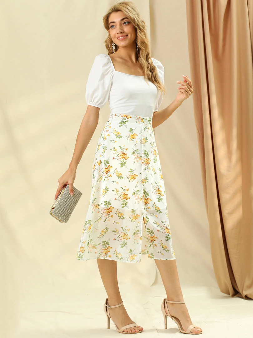 Allegra K Women’s Floral Split Front Summer Casual Elastic Waist Back Flowy Midi A-Line Skirt