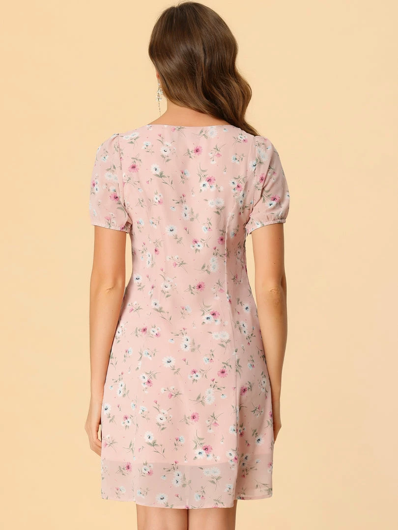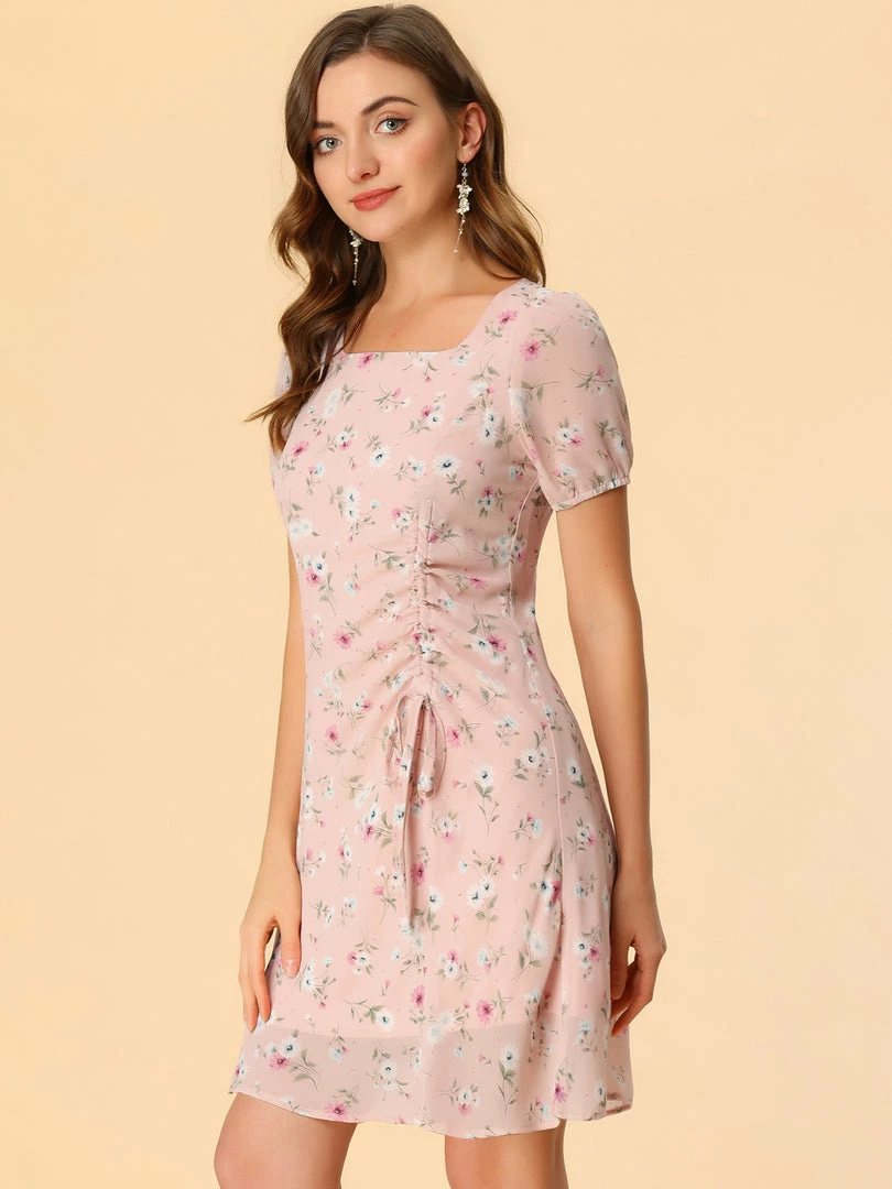 Allegra K Women’s Floral Square Neck Short Sleeve Drawstring Ruched Dress