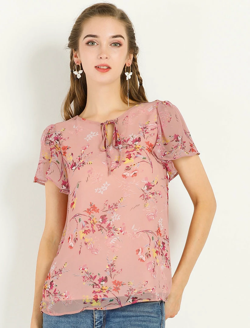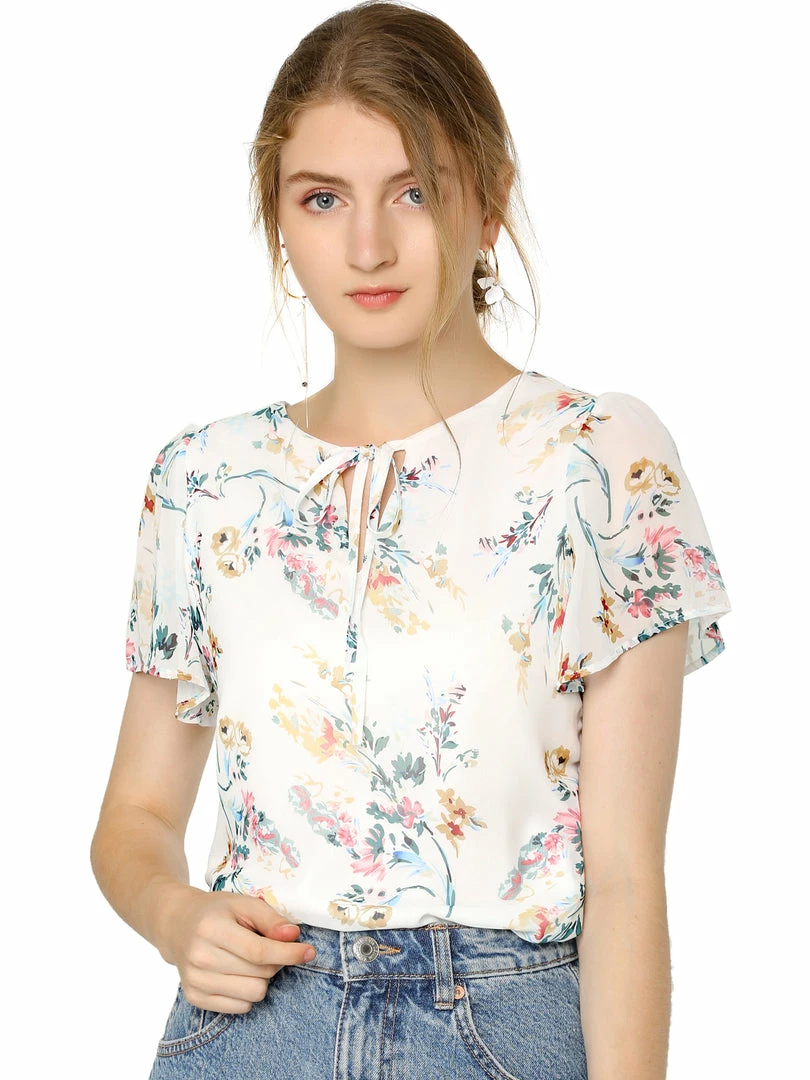 - With feminine flying sleeves details and ties at the neck , this sweet and versatile floral top works for pretty much every occasion.