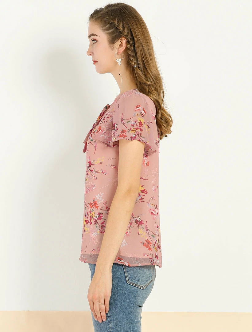 - Vintage floral sweeten a tie-neck blouse cut with swingy short sleeves in a relaxed silhouette.
