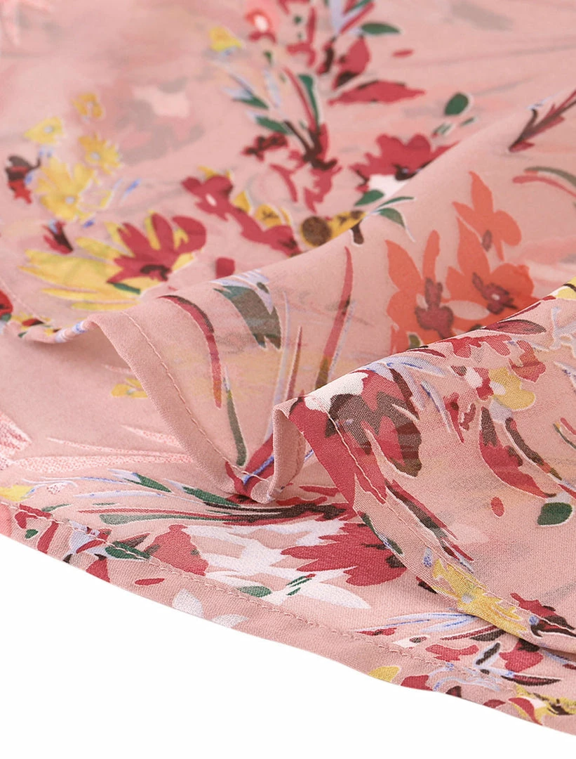 - Lightweight fabric, covered in a pink, yellow, and red floral print, shapes a tie V-neckline and flowing sleeves.