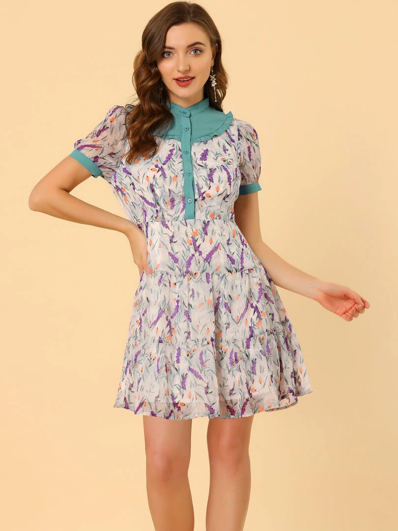 Allegra K Women’s Floral Tie Waist Stand Collar Puff Sleeve Ruffle Tiered Short Dress