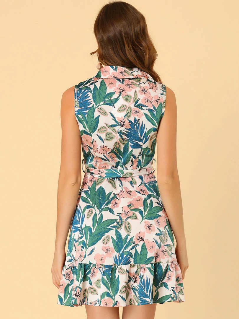 • Patterned with tropical floral, this sleeveless dress features ruffle hem, belt, button down.