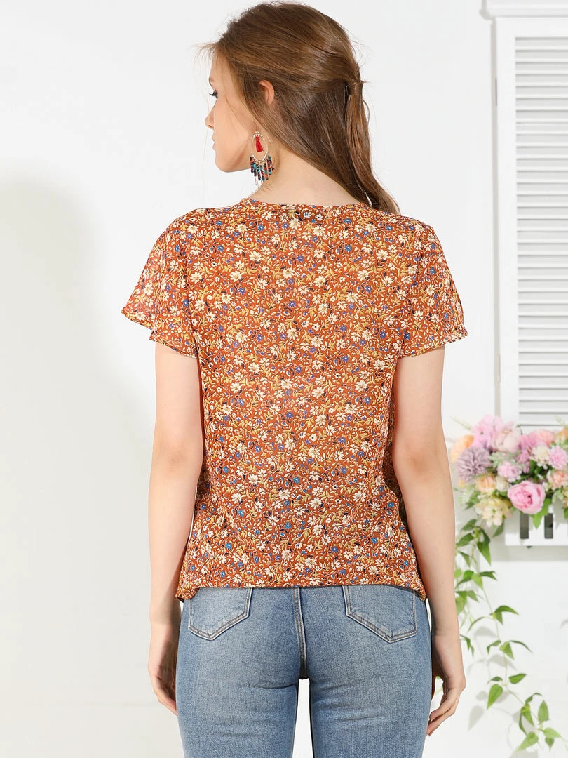 Allegra K Women’s Floral V Neck Blouse Short Sleeve Ruffled Ditsy Tops
