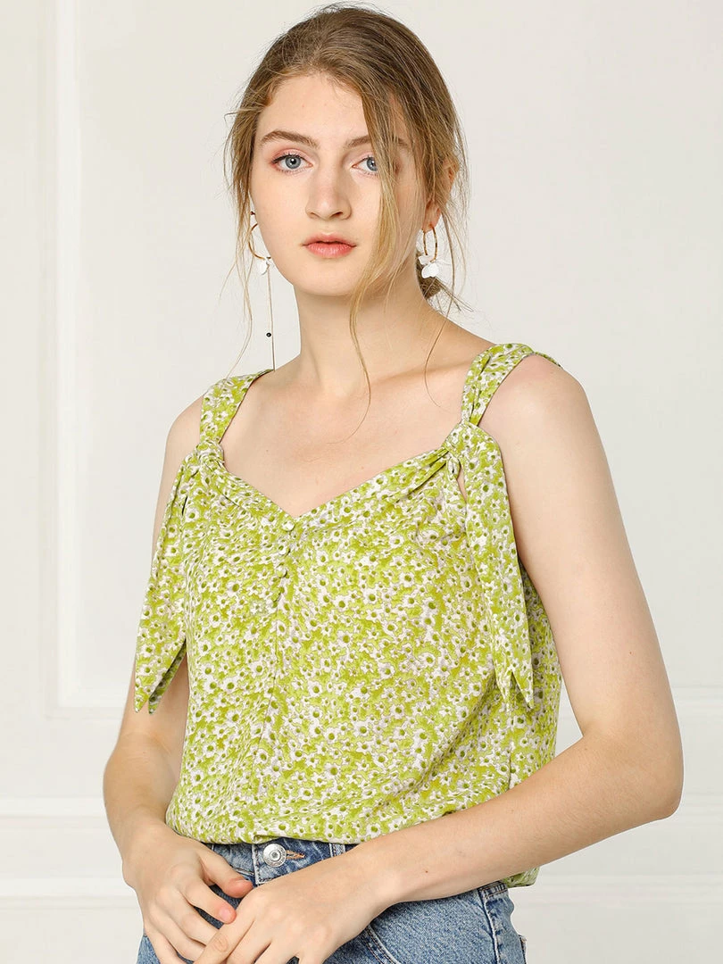 Allegra K Women’s Floral V Neck Knot Shoulder Cami Tank Sleeveless Blouse Top