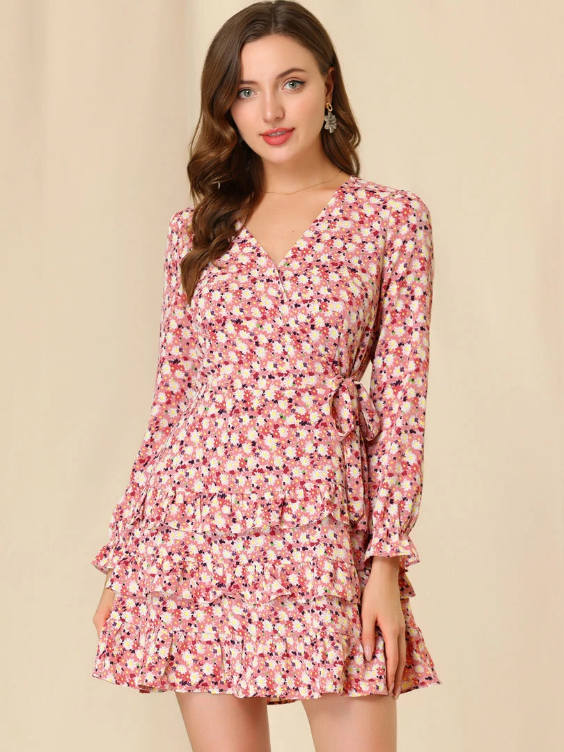 Women’s Floral Print V-Neck Long Sleeve Tie Waist Above Knee Layered Ruffle Hem Dress