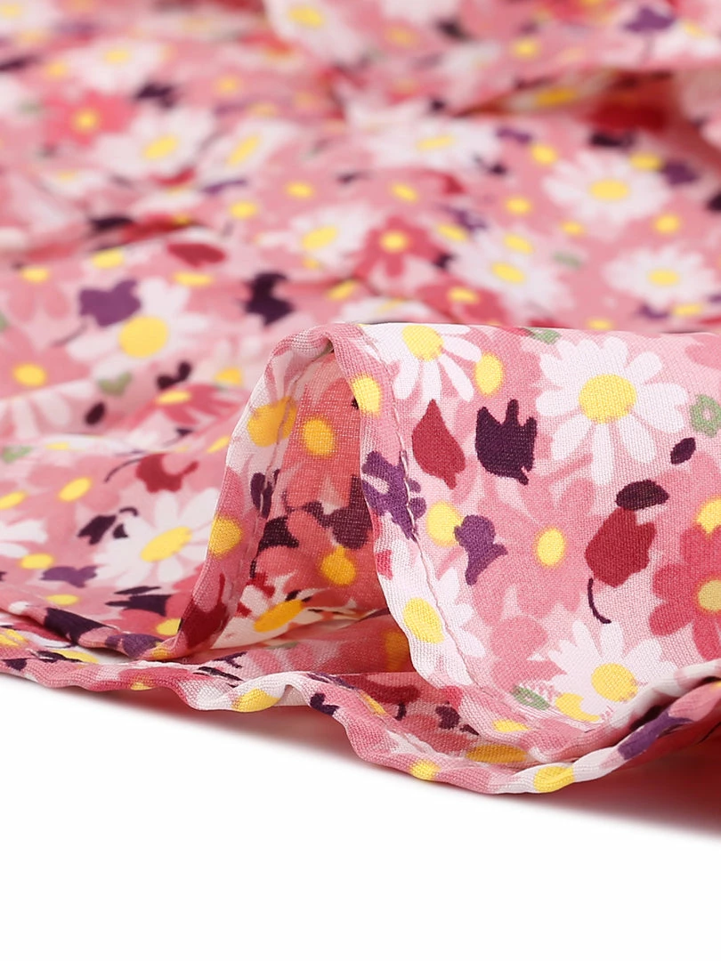 • Create a charming silhouette with the tie waist, ruffle trim and floral print design.