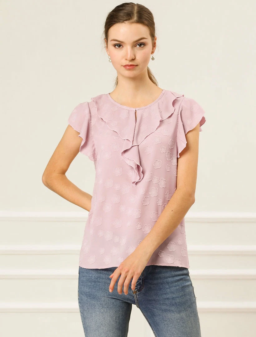 - This floral blouse is complete with a ruffled neckline, flutter sleeves, front keyhole with button and loop closure, crew neck.
