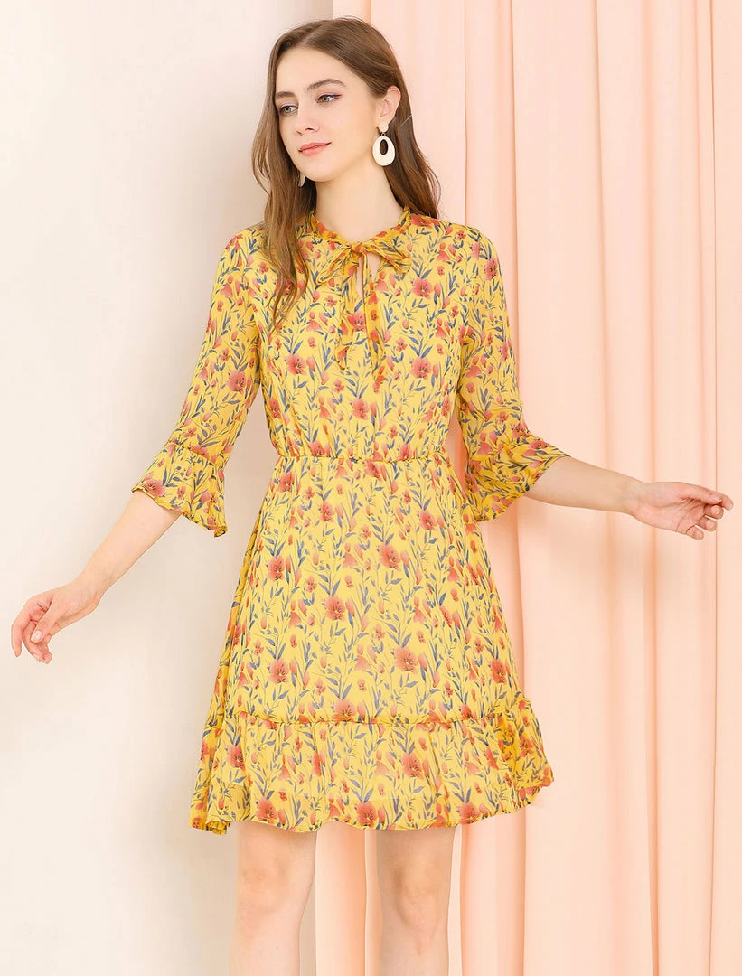 Allegra K Women’s Flutter Sleeve Tie Neck Ruffle Hem Ditsy Floral Dress