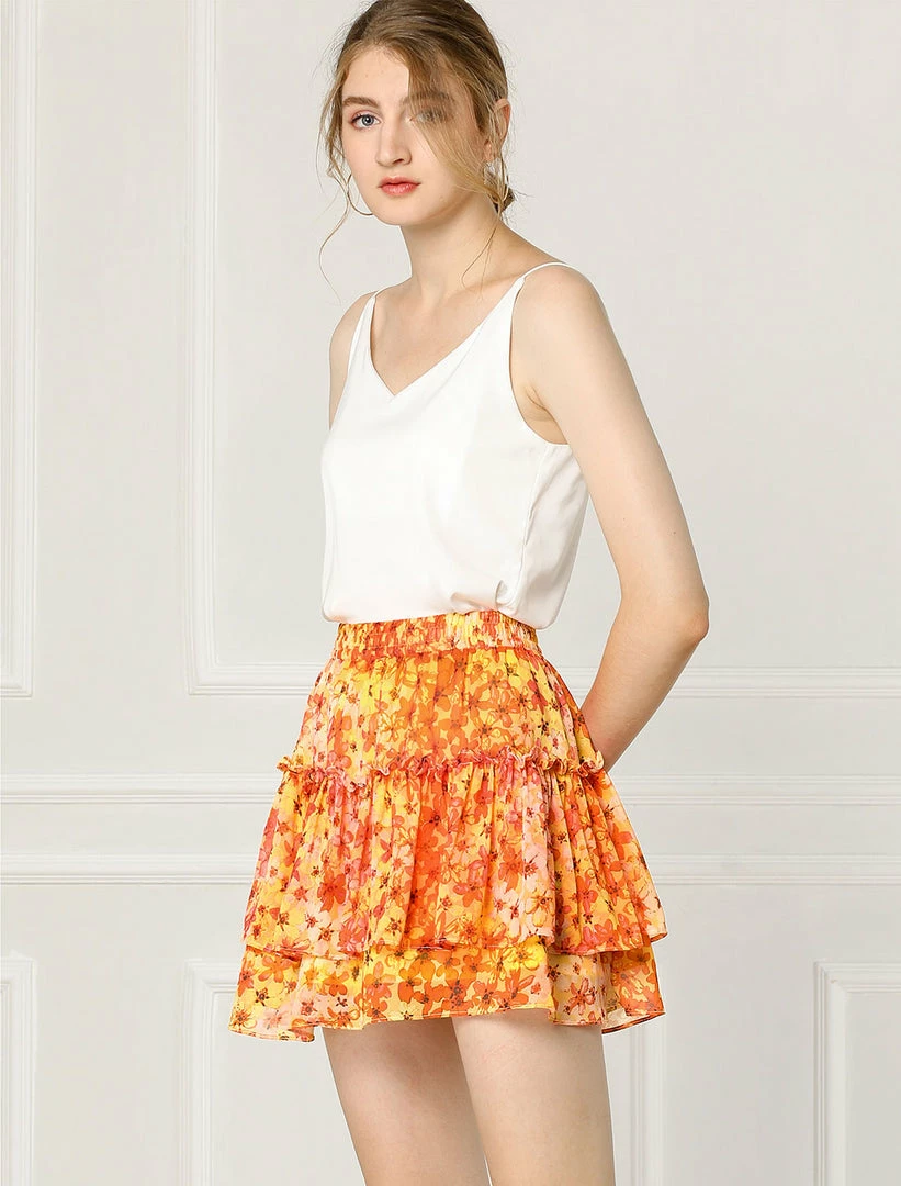 Allegra K Women’s Fresh Floral Print Skirt Elastic High Waist Layer Ruffle A-Line Mini Short Skirts