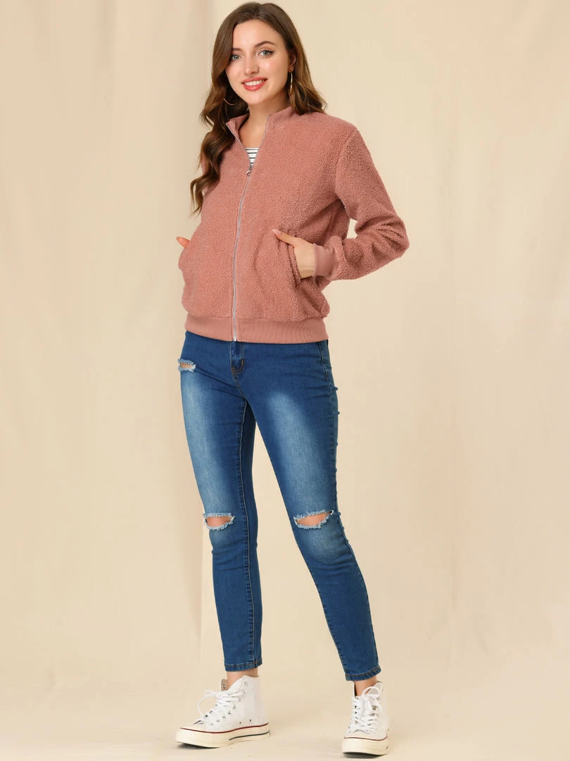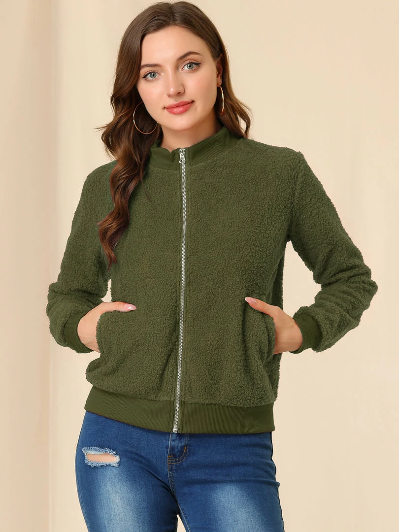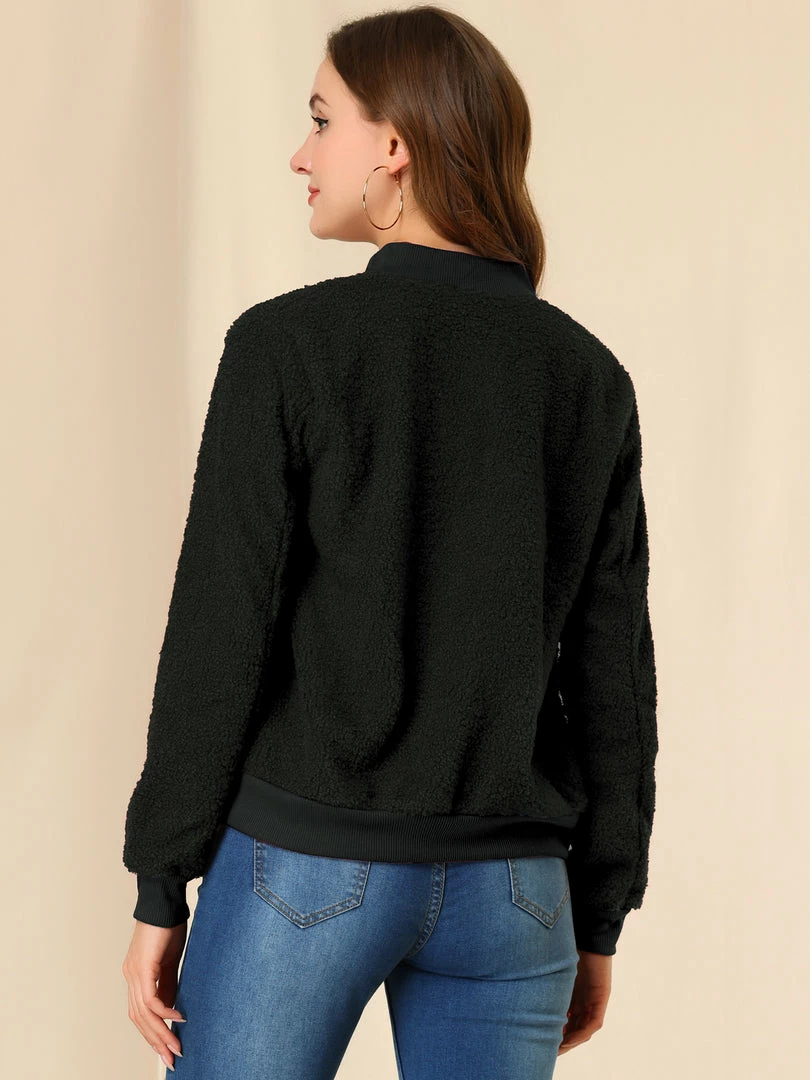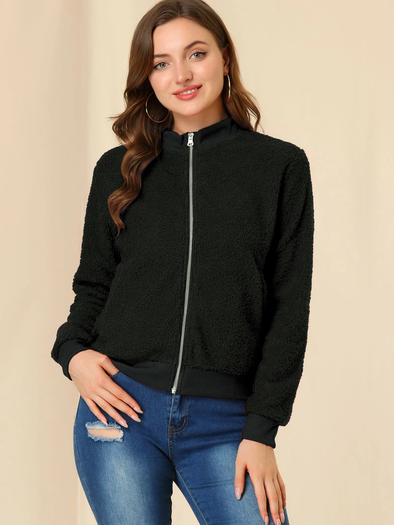 Allegra K Women’s Fuzzy Long Sleeve Casual Zip Up Bomber Jacket With Pockets