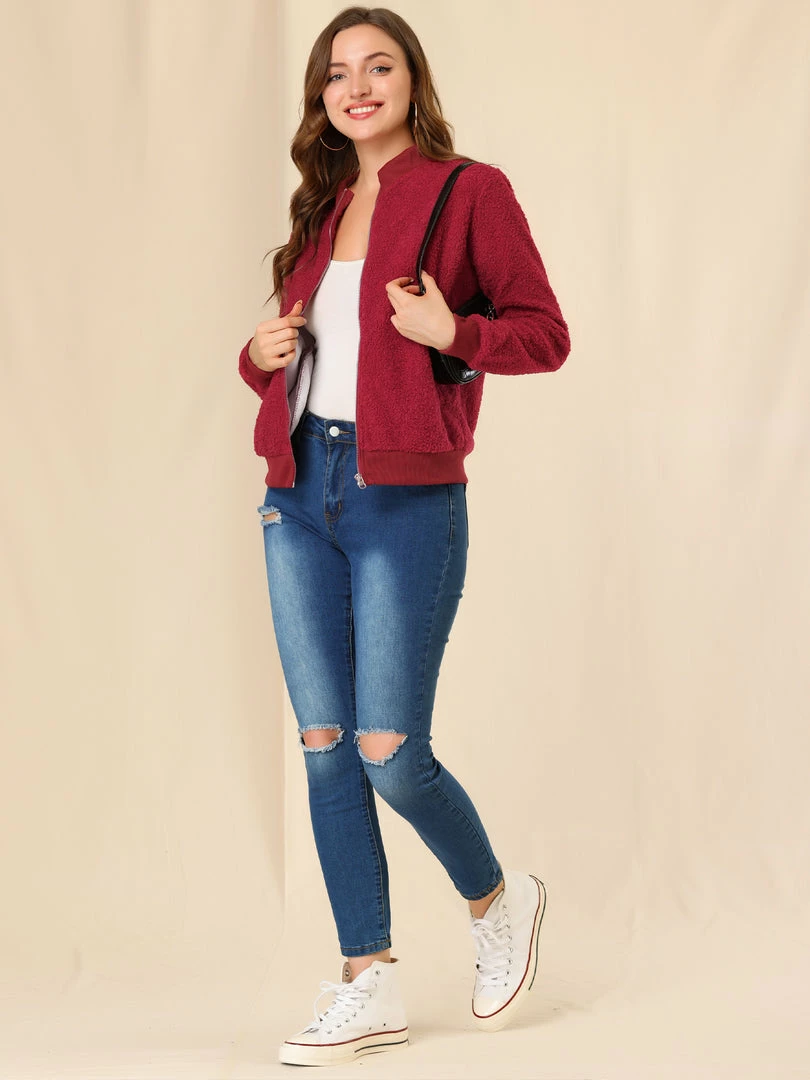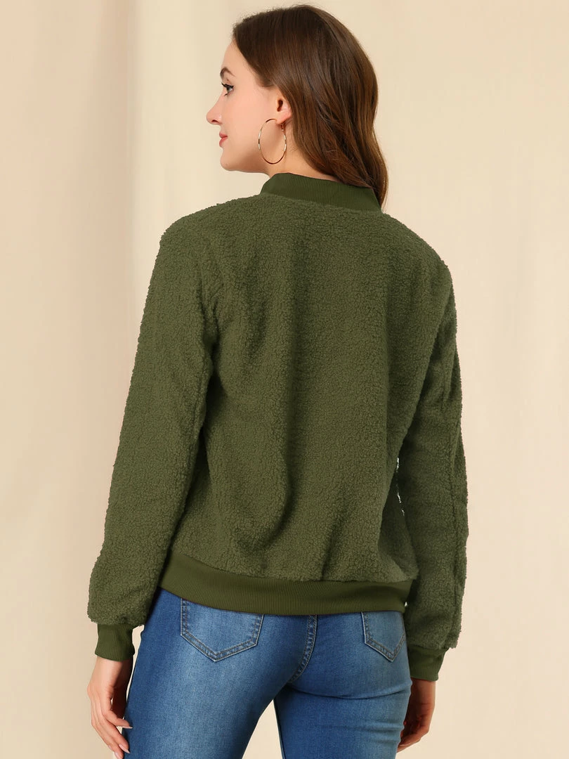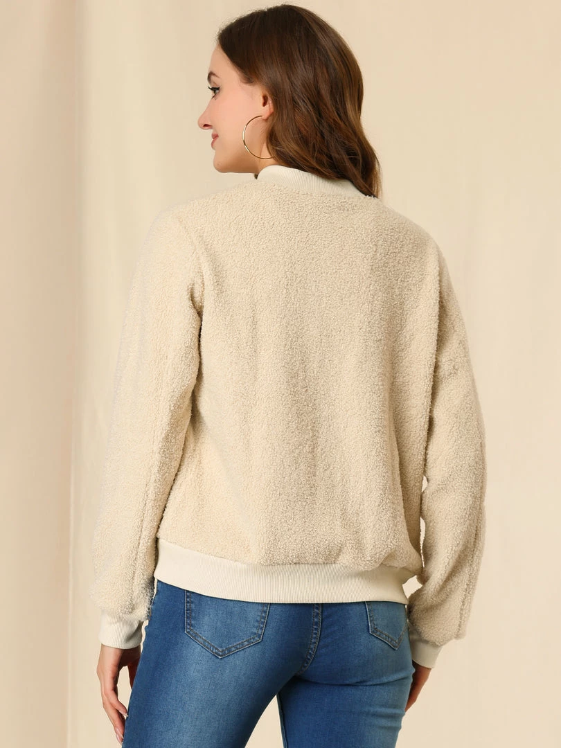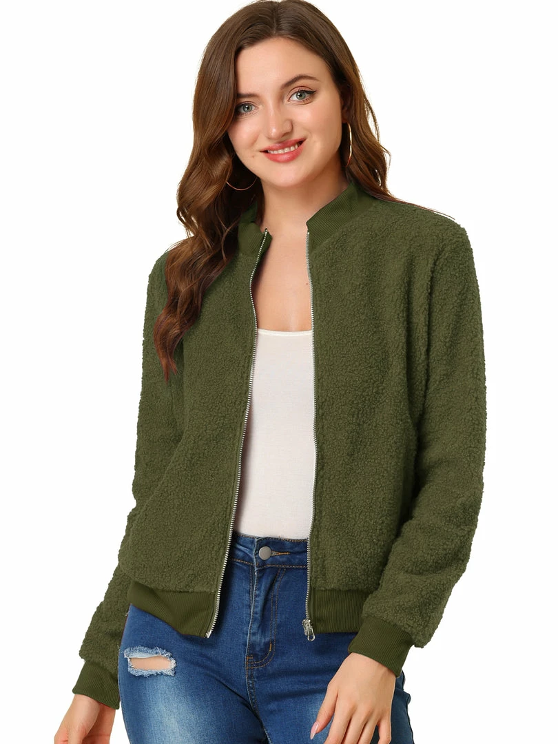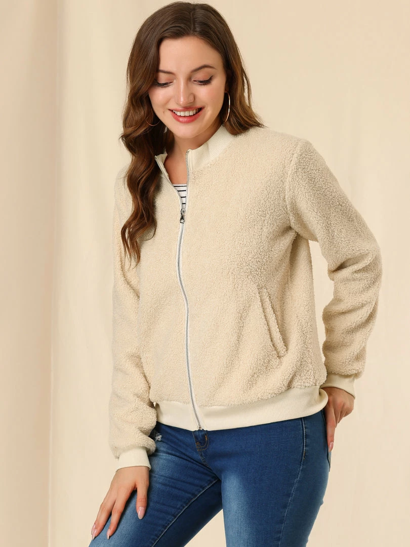 Allegra K Women’s Fuzzy Long Sleeve Casual Zip Up Bomber Jacket With Pockets