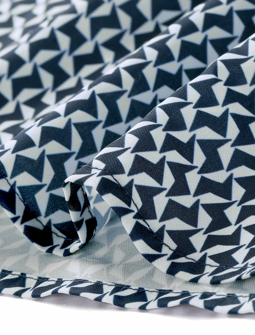 - Geometric prints provide an elegant and sophisticated base for this long sleeve blouse that gets further charm-enhanced with pleated the shoulder.