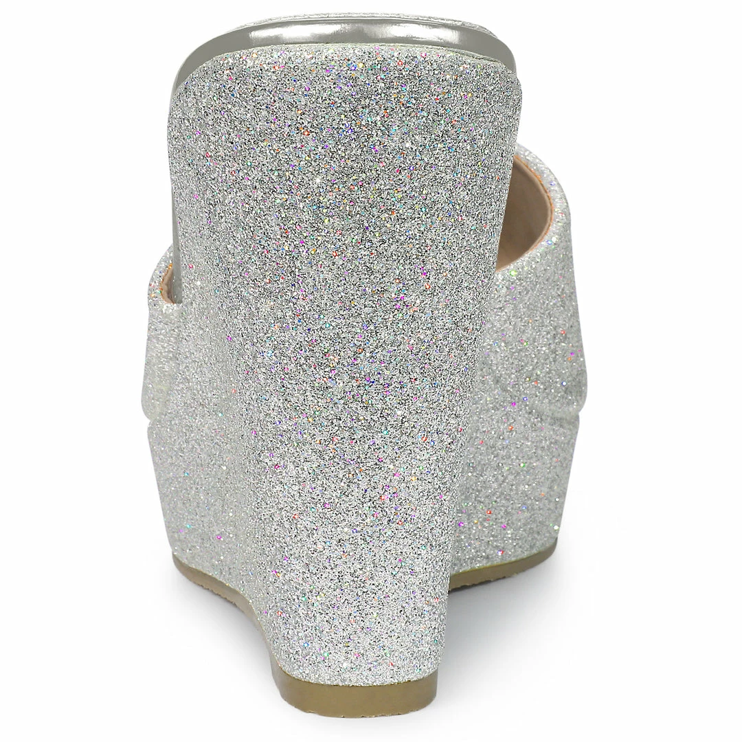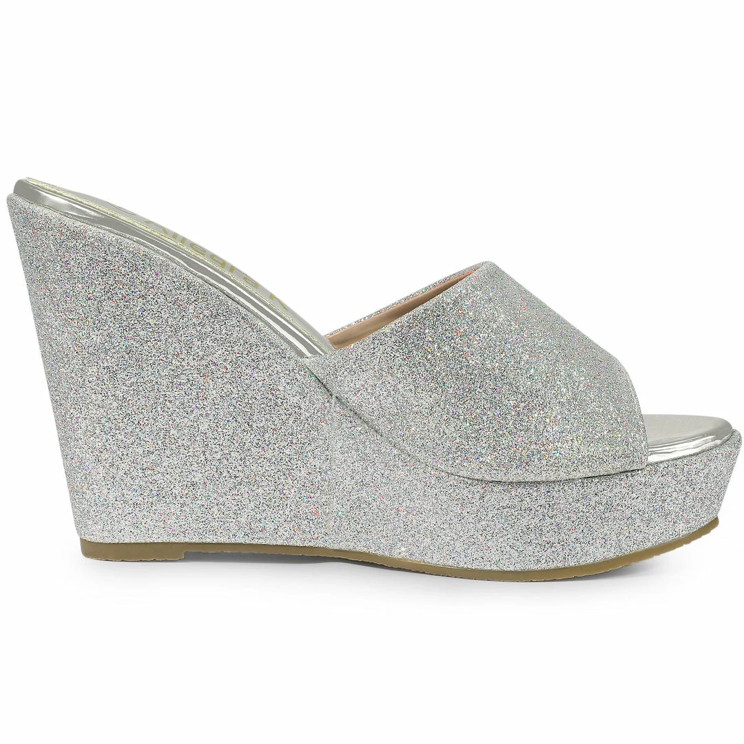 Add stylish footwear to your look with wedge heels sandals by Allegra K. Glitter creates the slip-on design and platform finish the look.