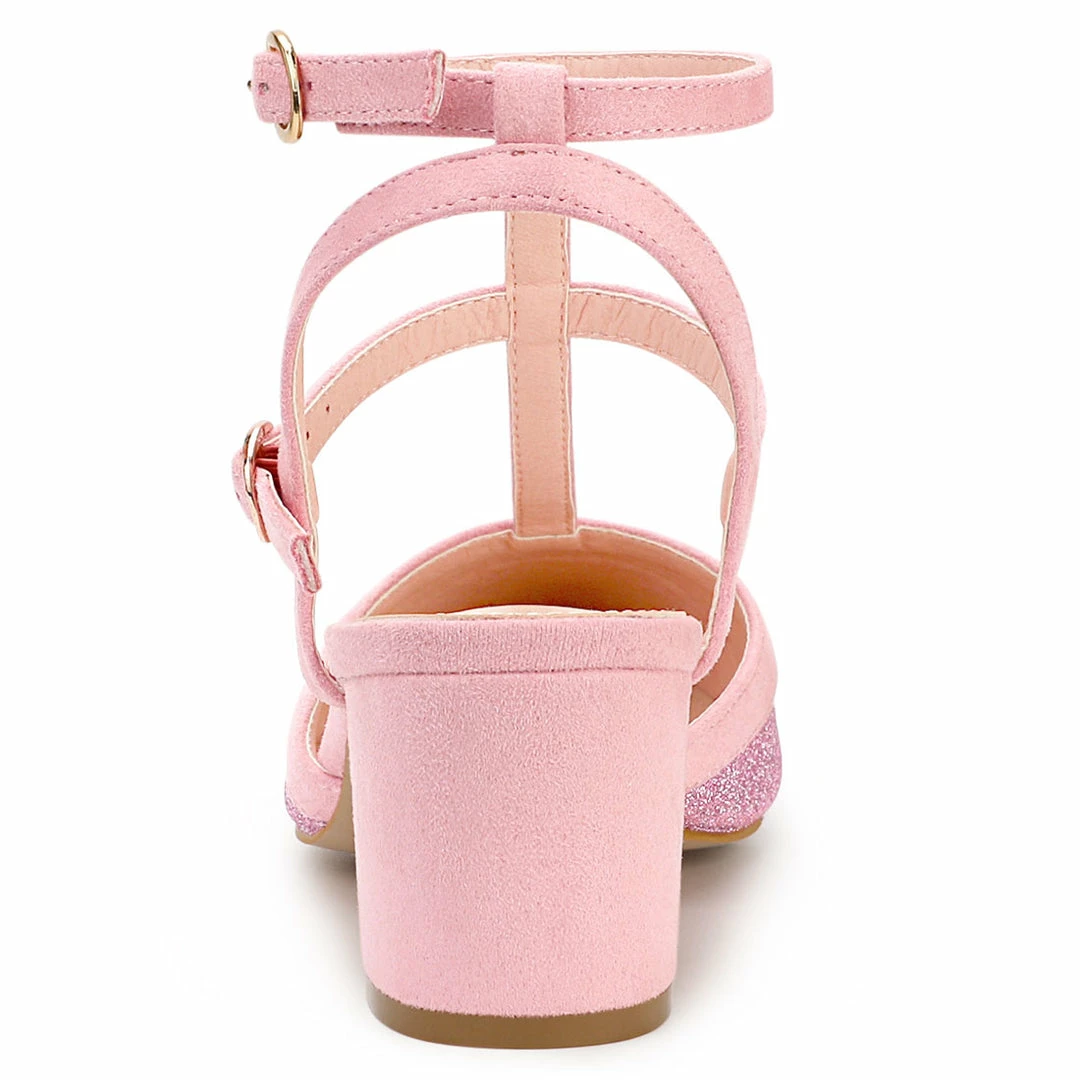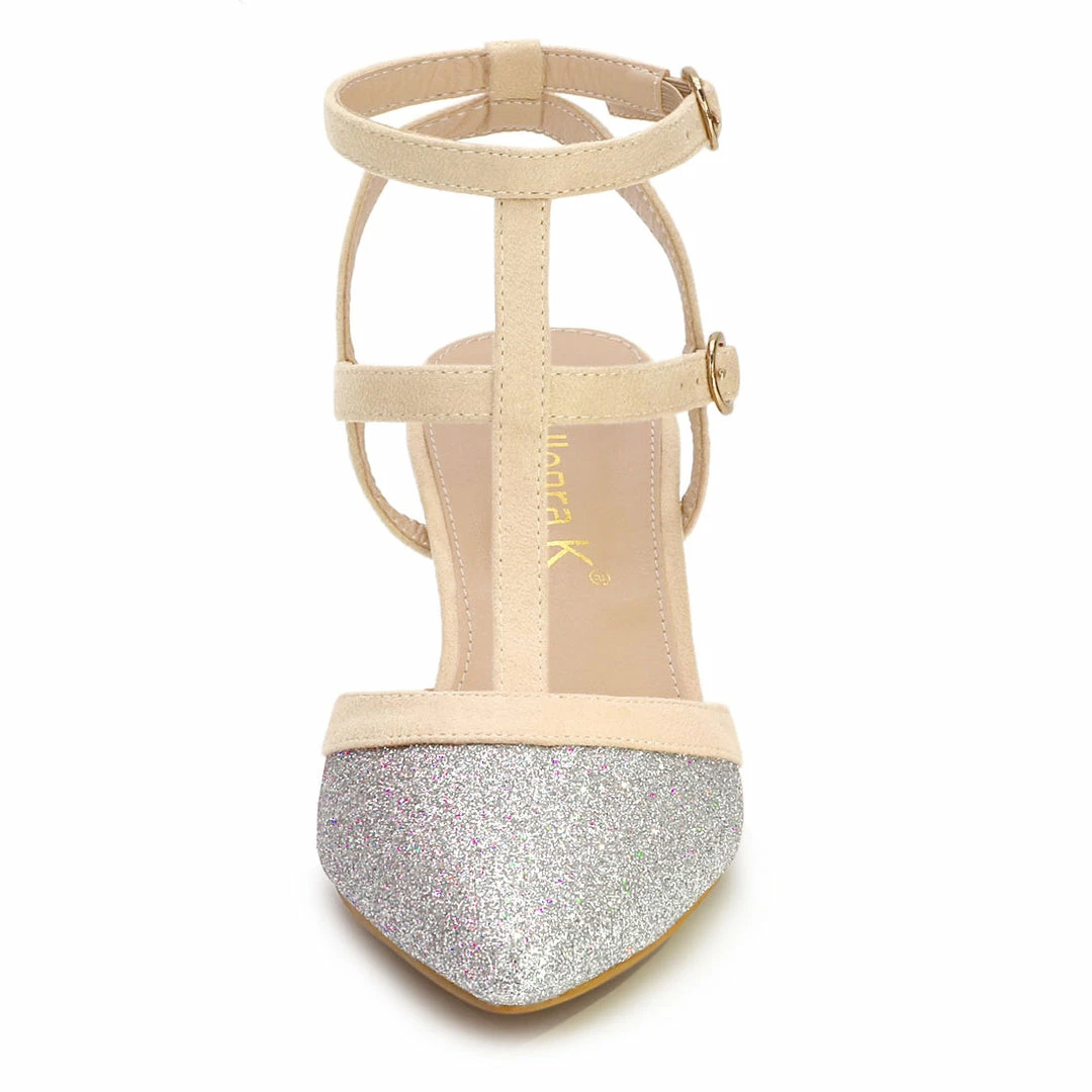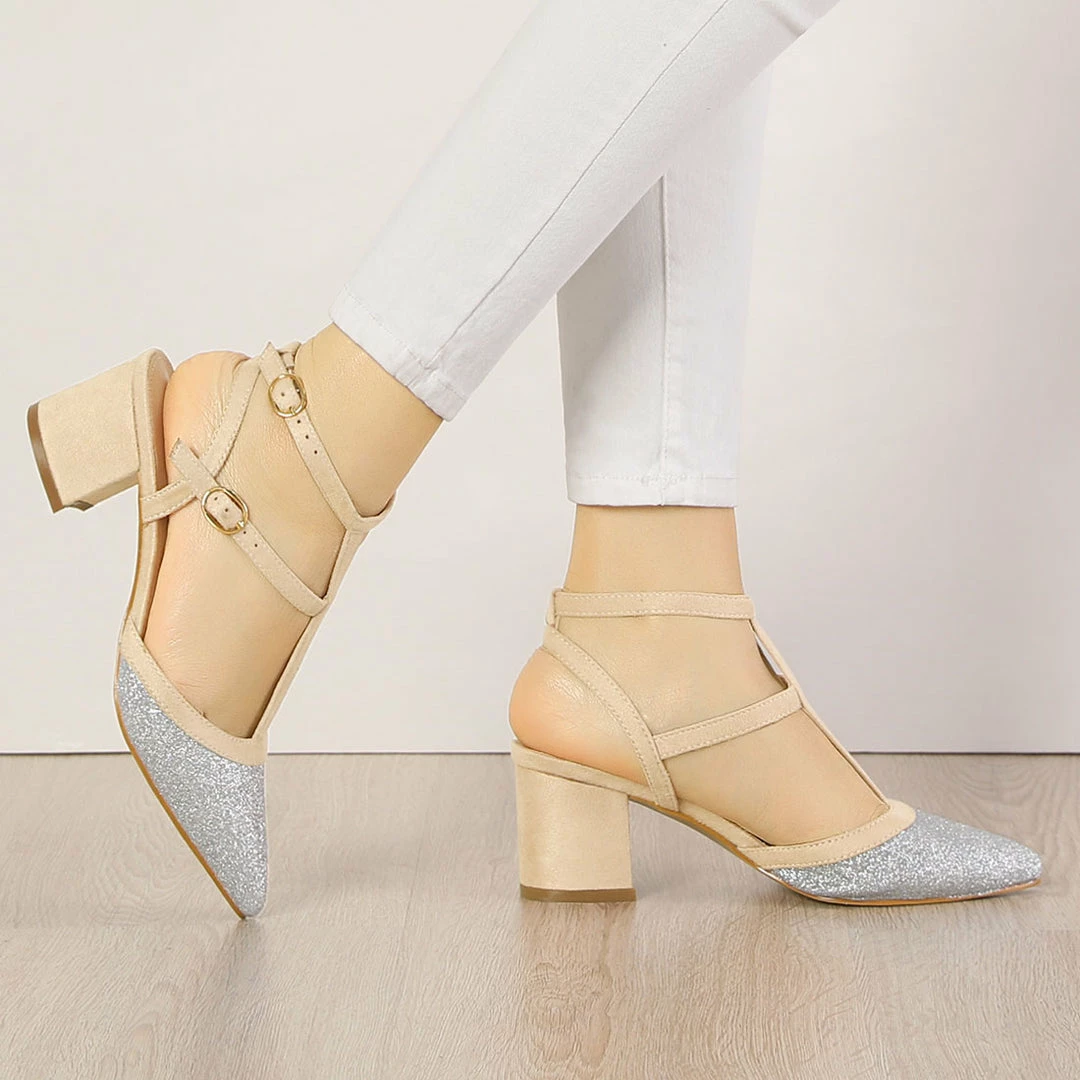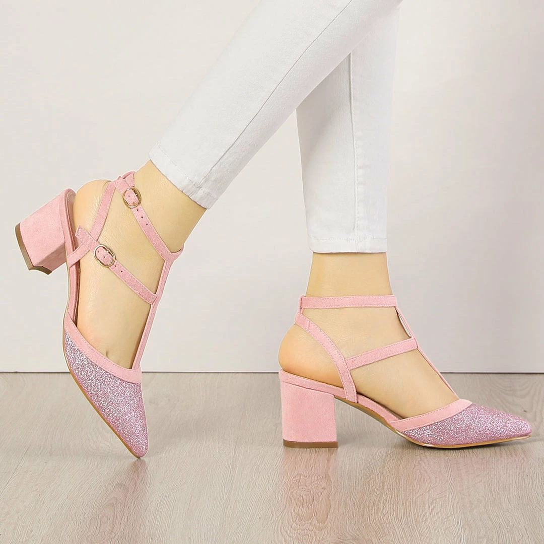 Our chunky heels with glitter upper, pointed toe and double buckle closure, are an easy way to accessorise your work wear.