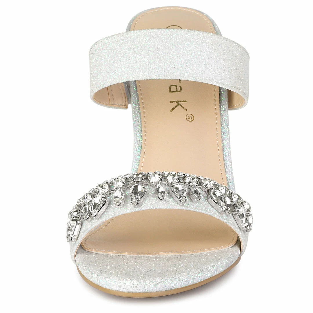 An essential summer slide sandal features double simple straps with a shimmering rhinestone, a mid-block heel, and work-to-weekend-to-wherever versatility.
