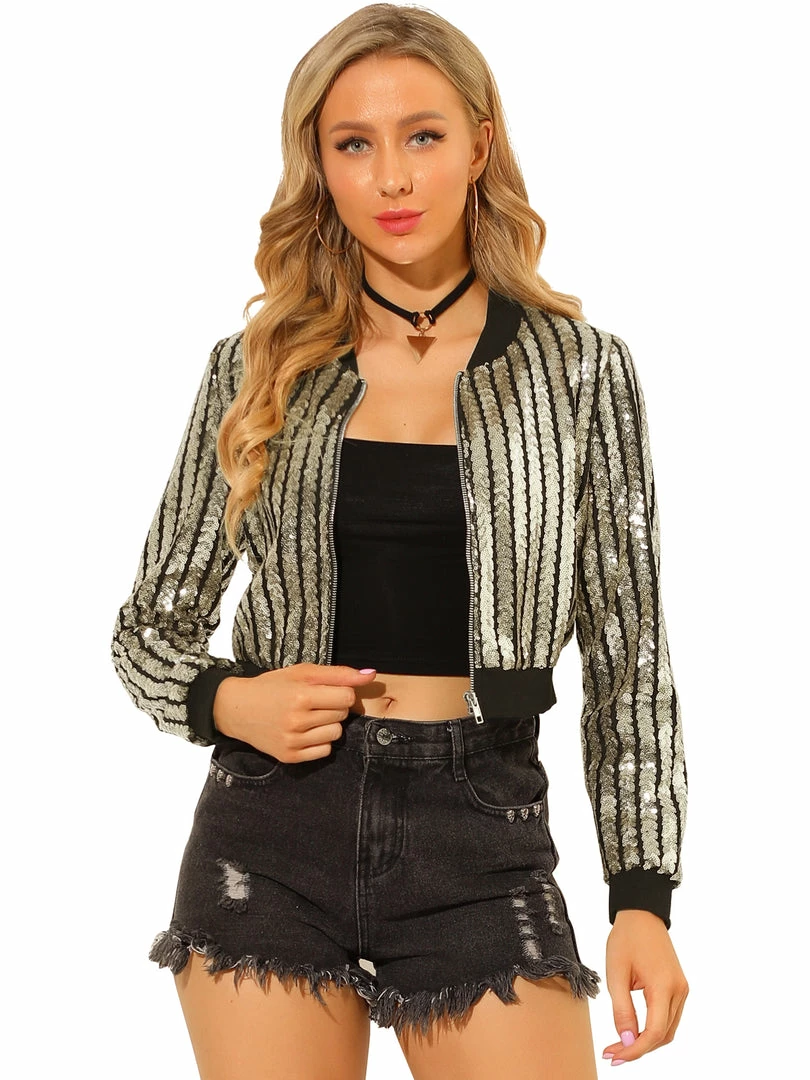 Allegra K Women’s Glitter Sparkle Long Sleeve Front Zip Party Shiny Crop Bomber Sequin Jackets