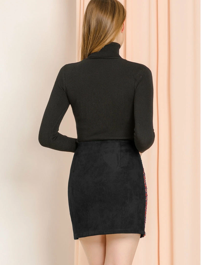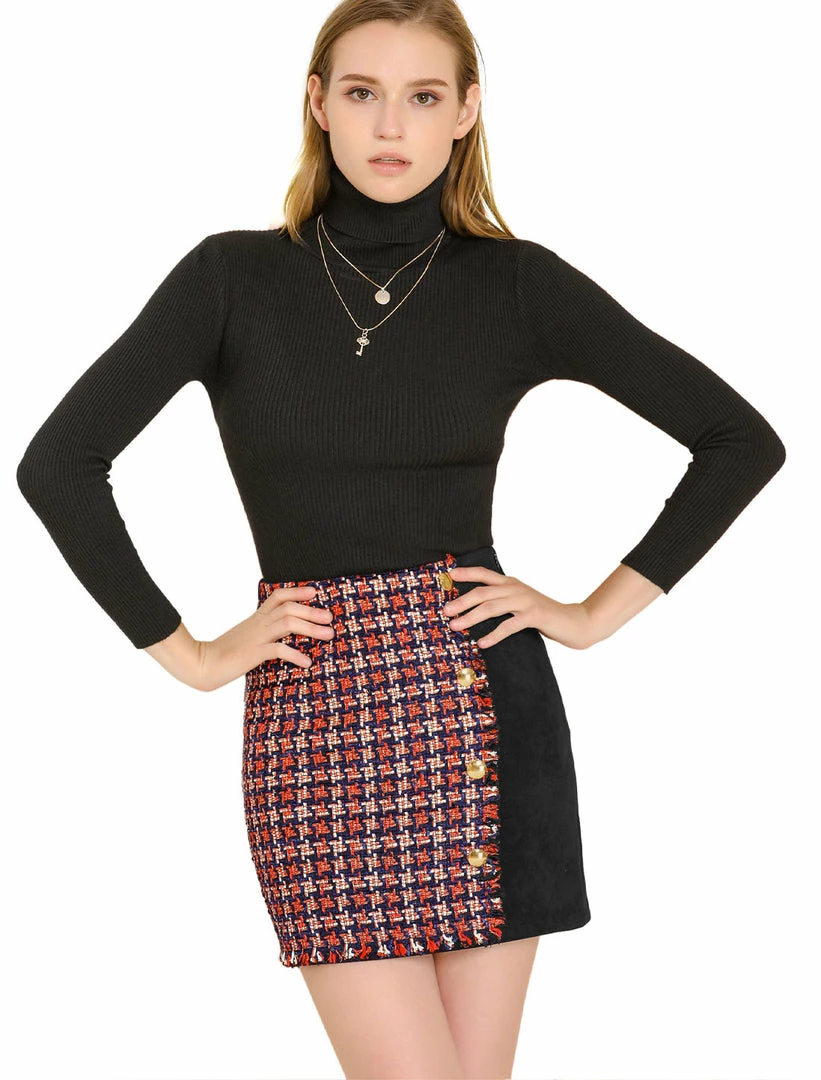 - Sturdy tweed, in a black, navy blue, white, and orange plaid pattern shapes this classic mini skirt, embellished with faux suede back for a look that’ll stand out among the rest.