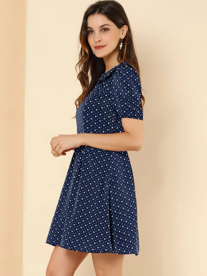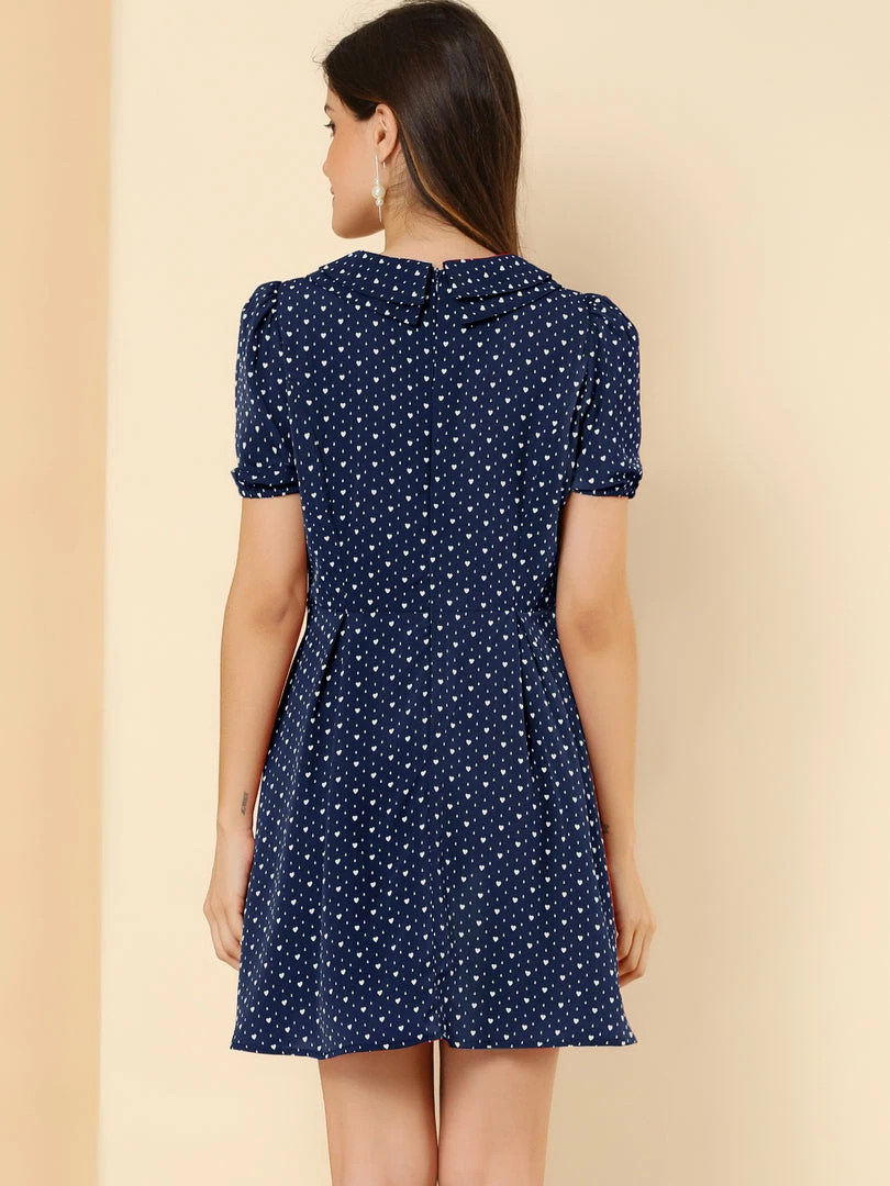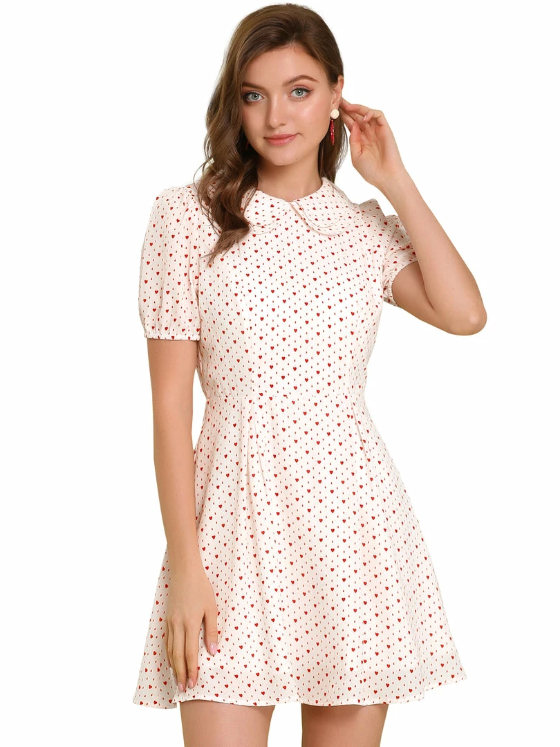 Allegra K Women’s Heart Print Dresses Puff Short Sleeve Chiffon Peter Pan Collar A Line Mini Dress