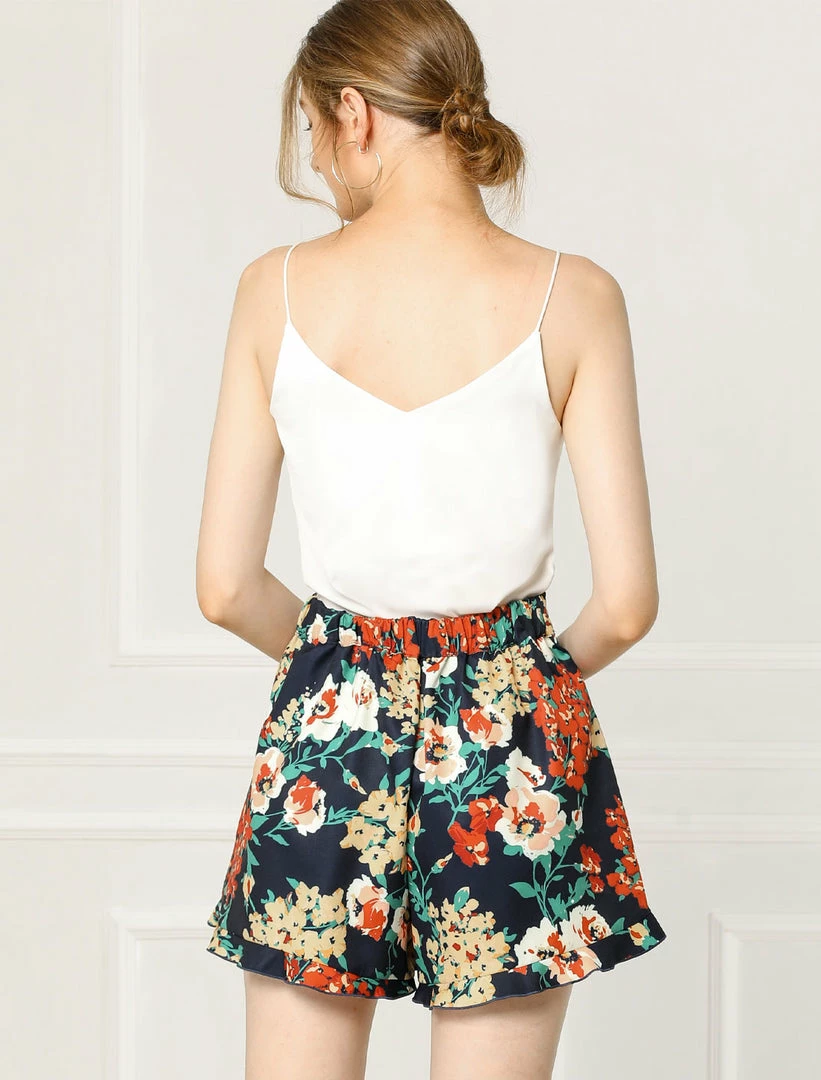 - Floral print shorts featuring layers with ruffled details at the front and elastic back with self-tie, this cute shorts add some highlights to your look.