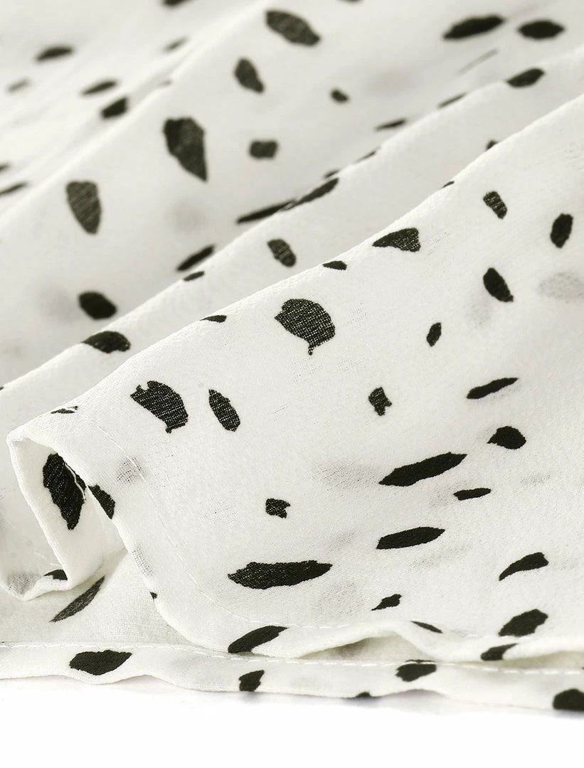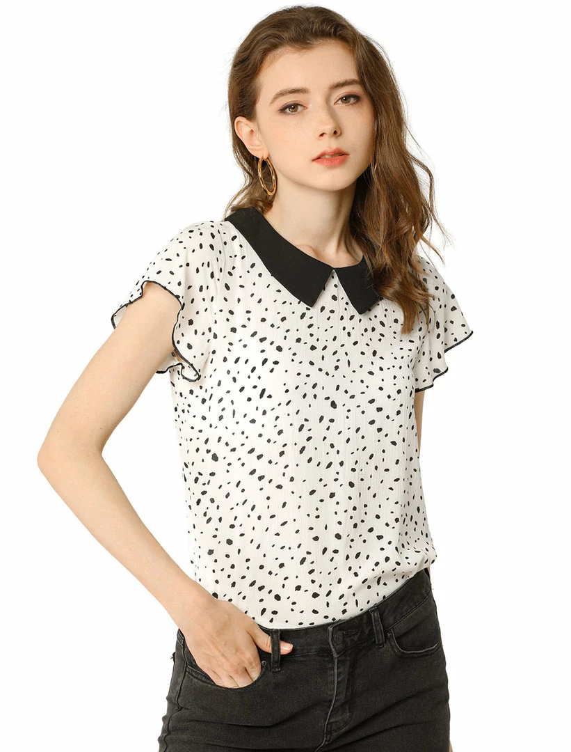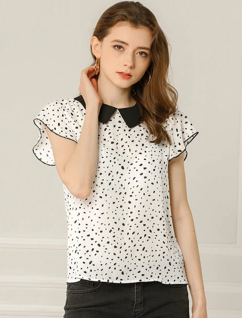 • Simple and delicate, this top features contrast Collar, ruffle decor flare sleeves and irregular plake dot.