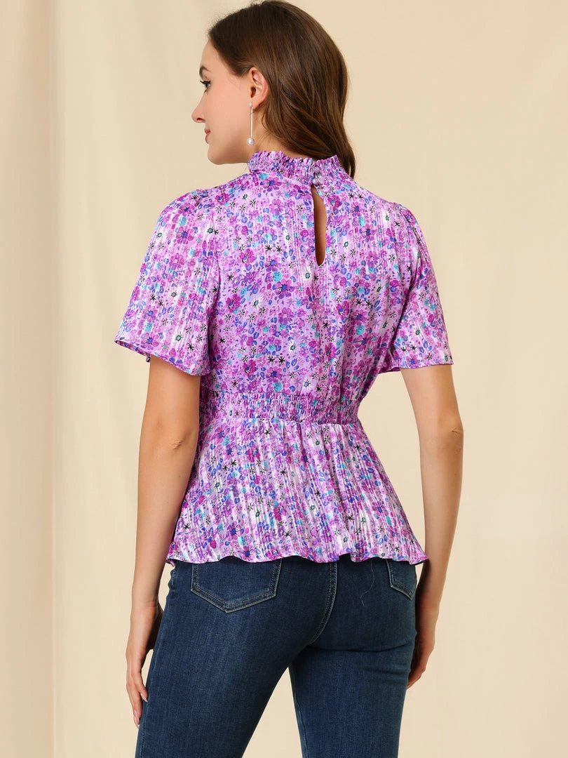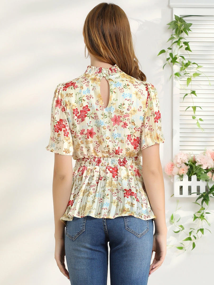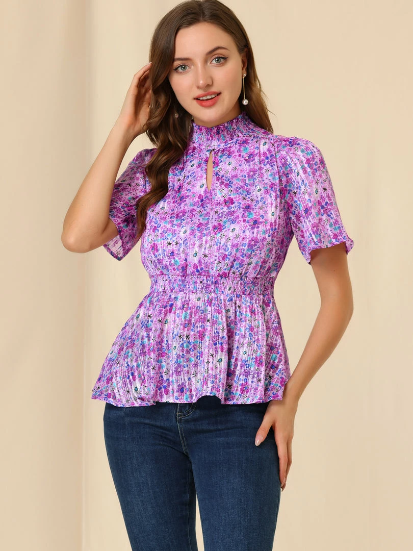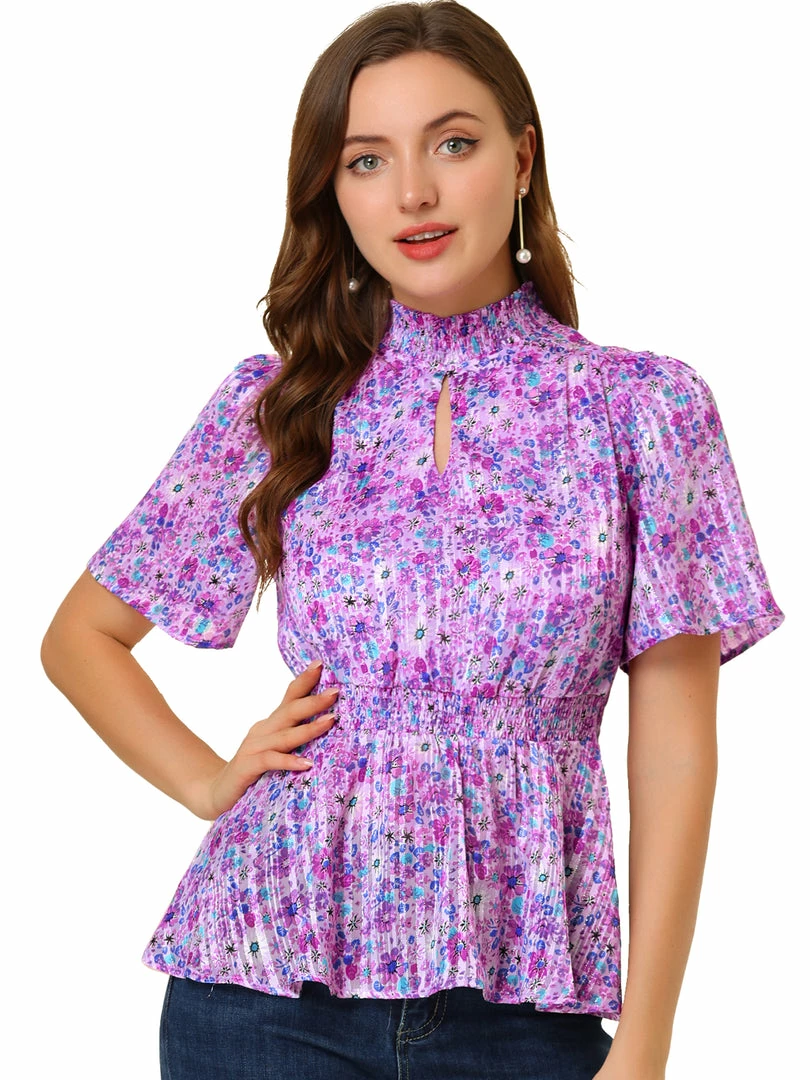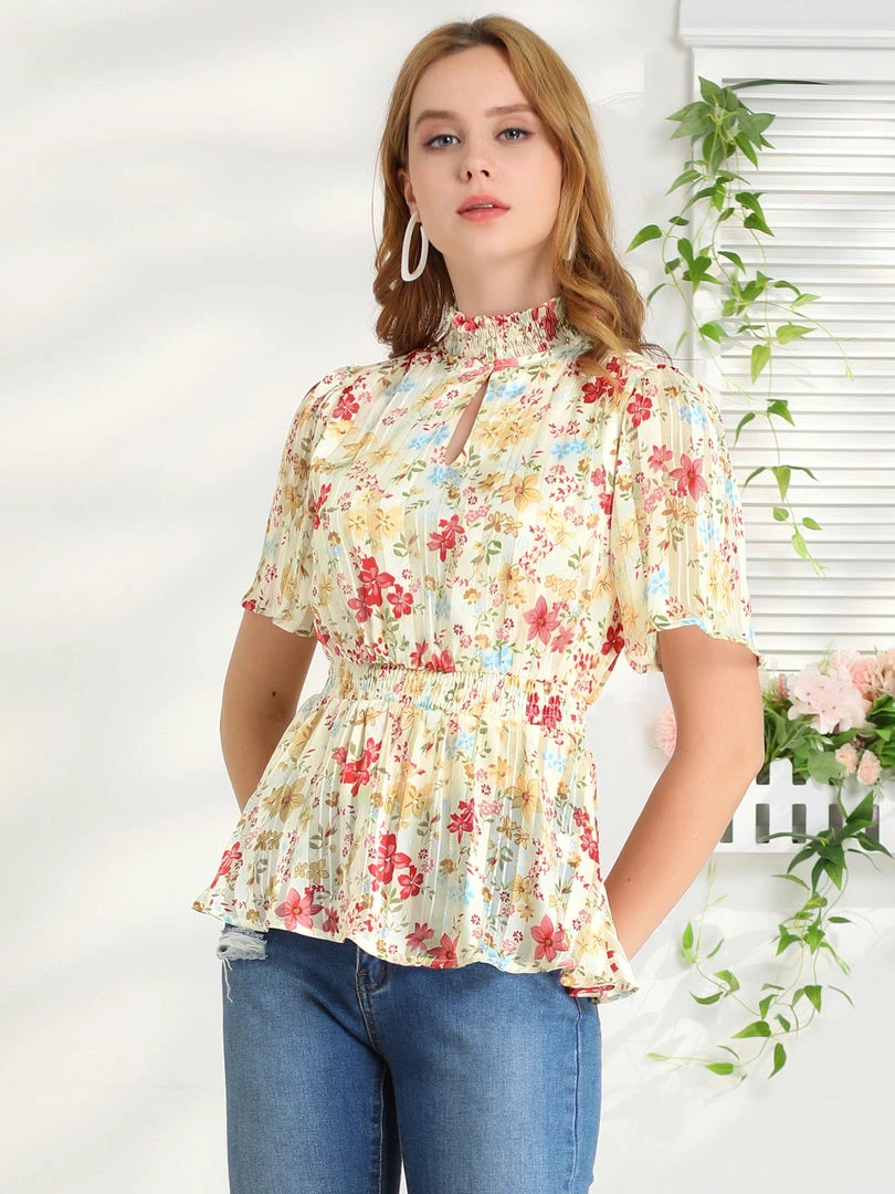 - Simple and delicate, this top features floral print, smocked stand collar, keyhole front, smocked waist, and short flare sleeve.
