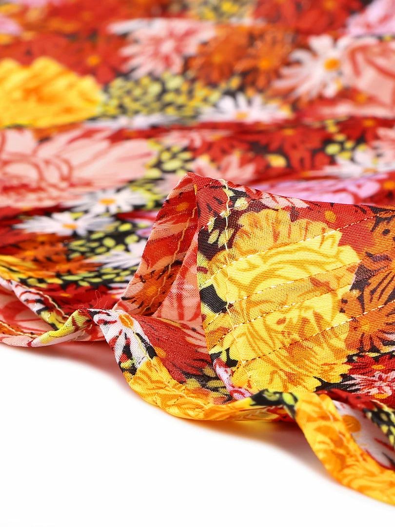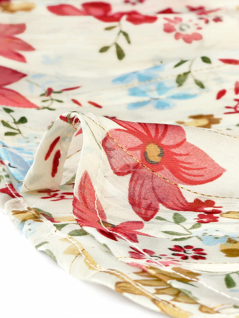 - Enchanting blooms sweeten this blousy ruffle neck top.