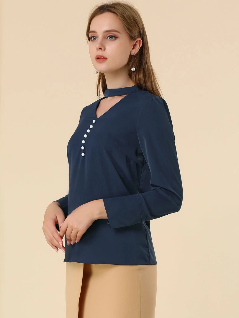 Allegra K Women’s Keyhole Stand Collar Blouse Long Sleeve Button Front Work Shirt Top