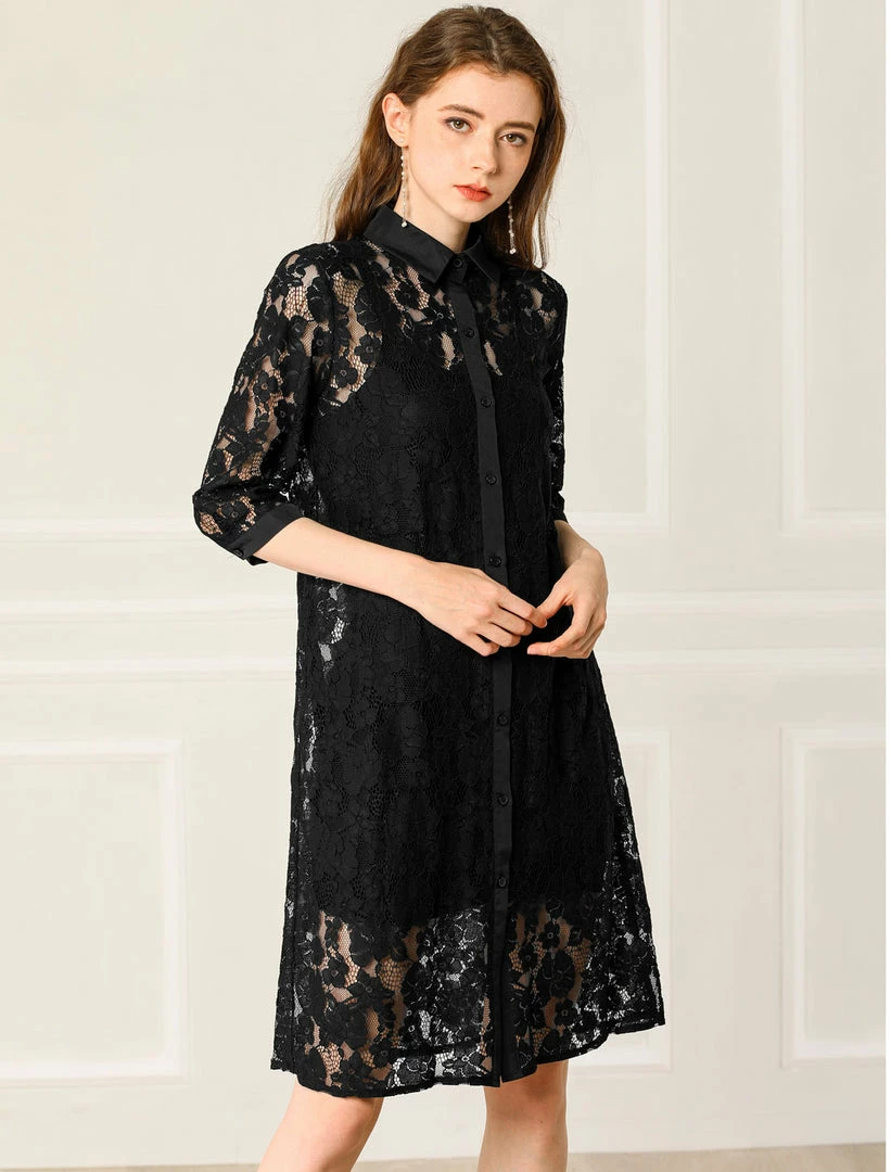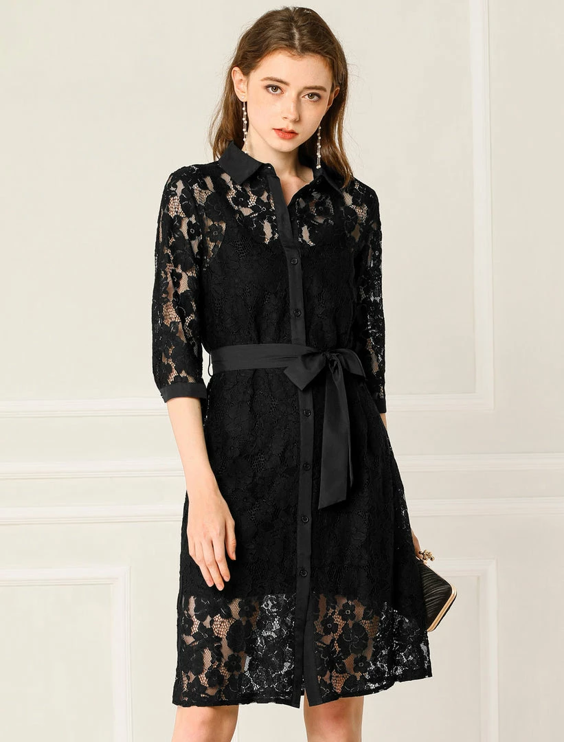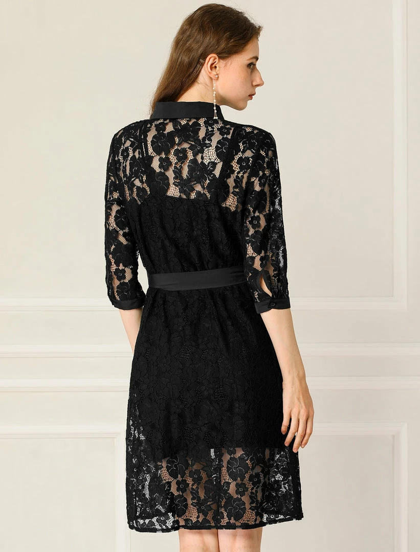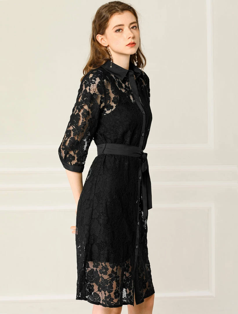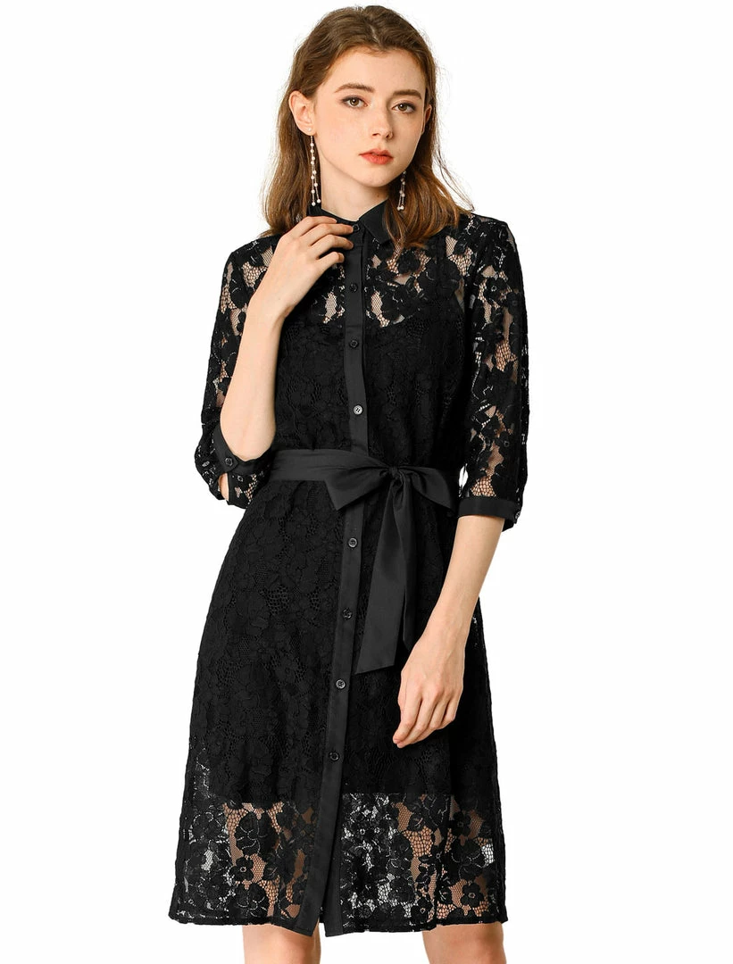 Allegra K Women’s Lace Semi Sheer Tie Waist Belted Turn Down Collar 1/2 Sleeve Solid Below Knee Floral Button Down Shirt Dress