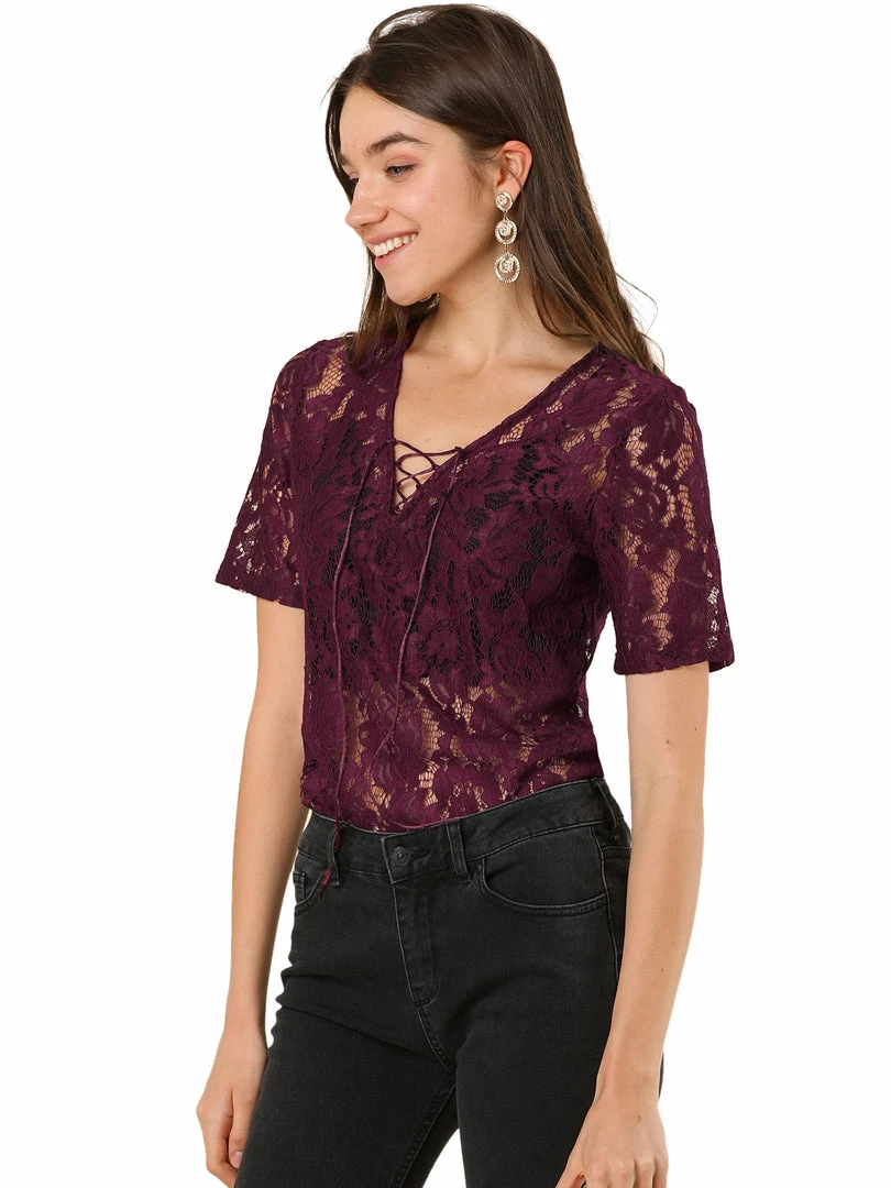 Allegra K Women’s Lace Top Vintage Short Sleeve Tie Neck Floral Blouse