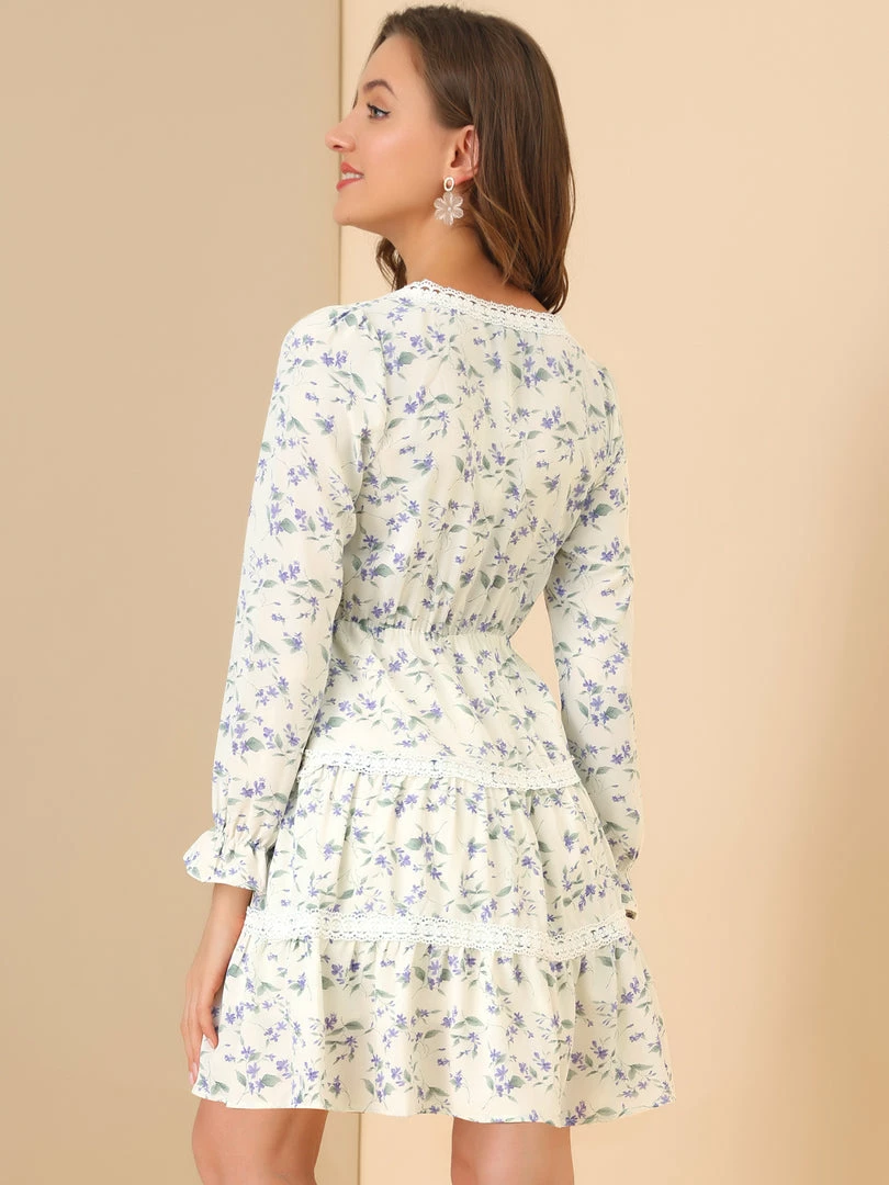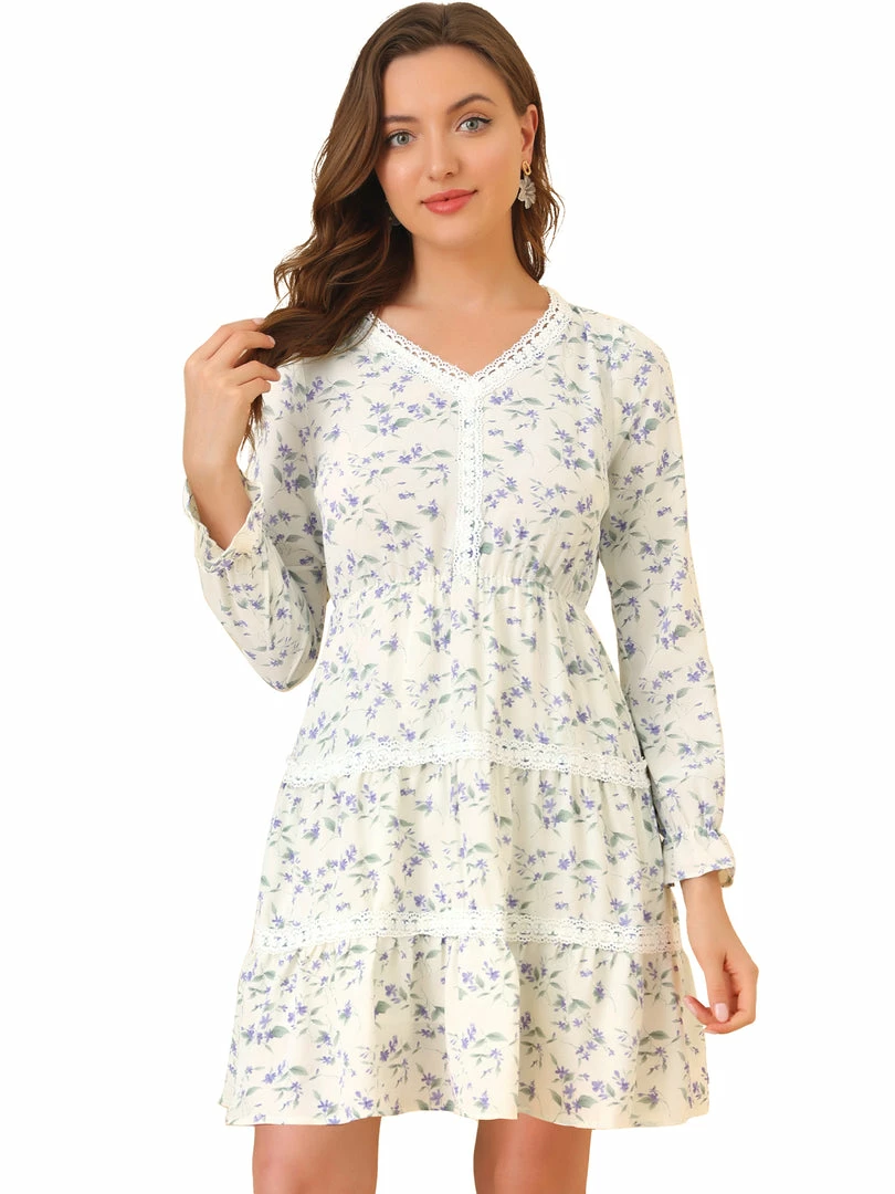 Allegra K Women’s Lace Trim V Neck Swing Floral Tiered Dress