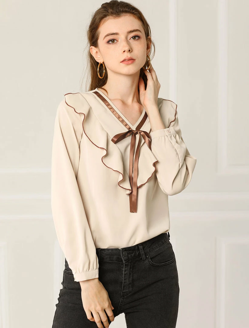 - Tie V Neck along with an elegant style ruffled gives us contrast color trim top a whimsical fashion touch.